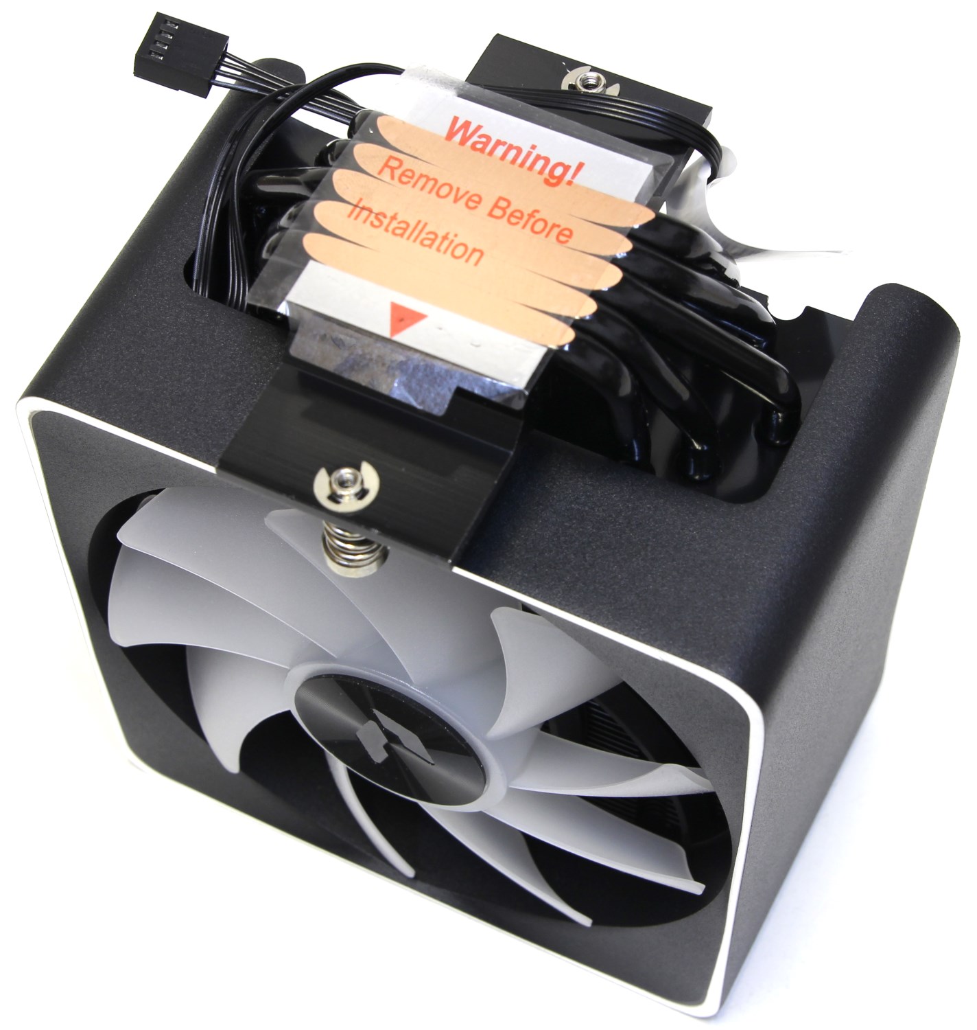 Да, спереди находится изображение устройства, но выполнено оно под каким-то странным ракурсом и кажется, что кулер похож на куб с вентилятором на одной из его сторон.