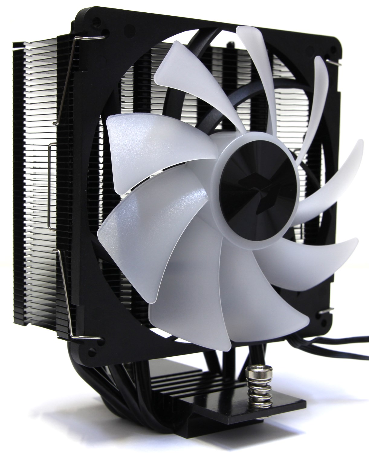 Вентилятор достаточно тихий на обычных оборотах. На максимальных он начинает заметно шуметь, но тут уже ничего не поделаешь. Конечно, можно установить резистор, но тогда пострадает эффективность. Теплорассеиватель состоит из пяти медных тепловых трубок и множества тонких алюминиевых пластин. Всё это окрашено в чёрный цвет и смотрится отлично. Вентилятор оборудован ARGB-подсветкой и может синхронизироваться через приложение материнской платы. Подсветка подключается отдельным кабелем с двумя разъёмами на конце для того, чтобы можно было подключить ещё какое-нибудь устройство.