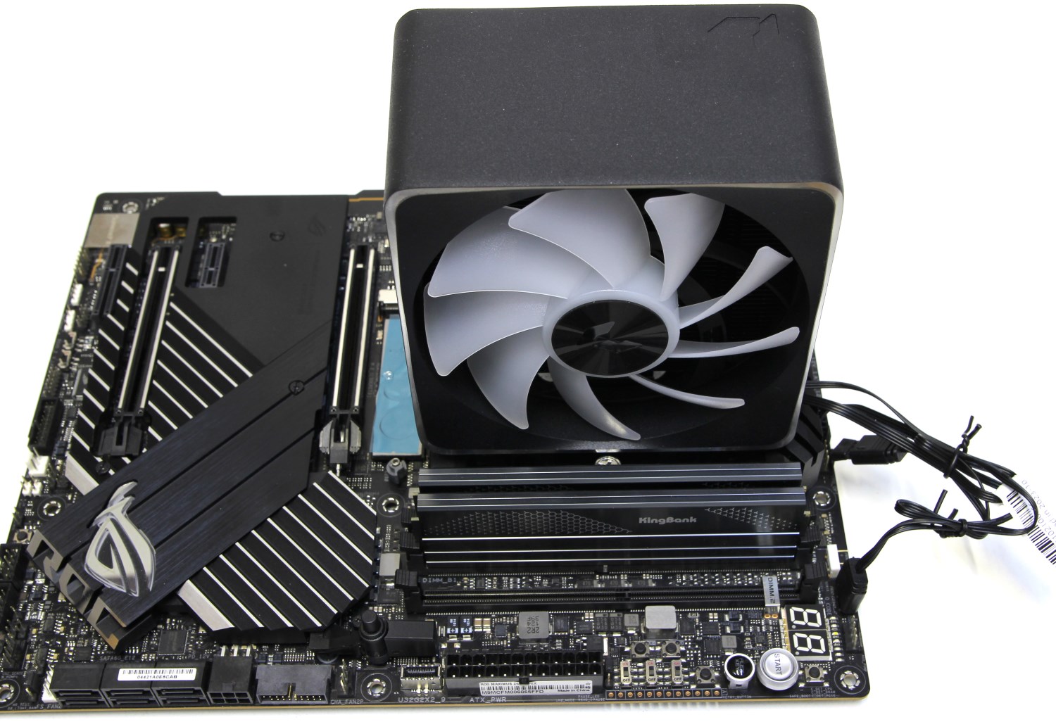 Кулер выглядит массивно и необычно благодаря своей конструкции. С определённого ракурса может действительно показаться, что это такой монолитный кусок алюминия, в котором есть круглое отверстие, где установлен вентилятор.