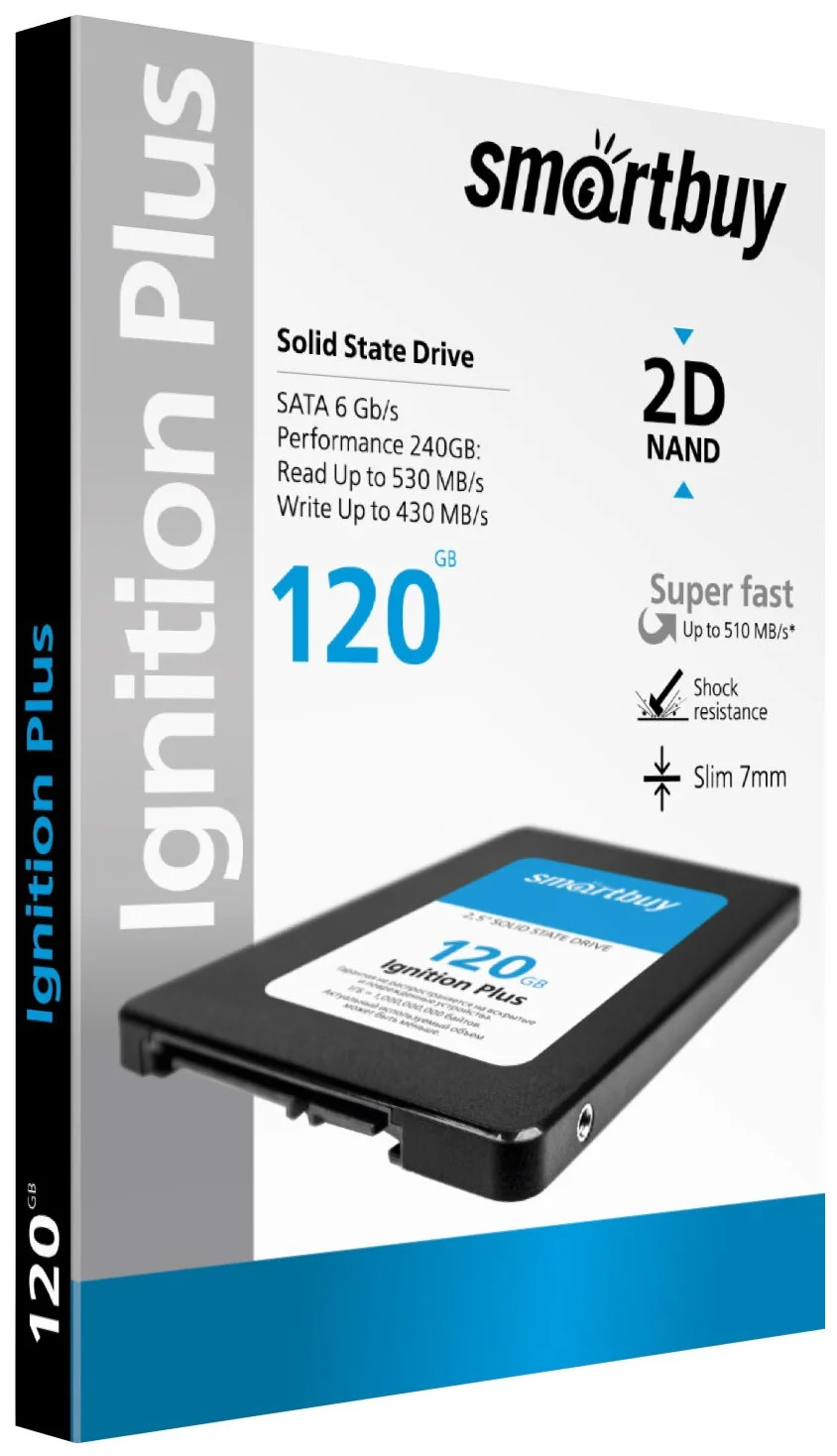 SmartBuy Ignition Plus 120GB. Объем – 120 Гбайт, имеется поддержка SATA интерфейса третьей версии SATA-III (SATA-600). Линейная скорость чтения находится на уровне 530 МБ/с, скорость записи на уровне 430 МБ/с, что вплотную приближается к пропускной способности самого стандарта SATA-III – 600 МБ/с.