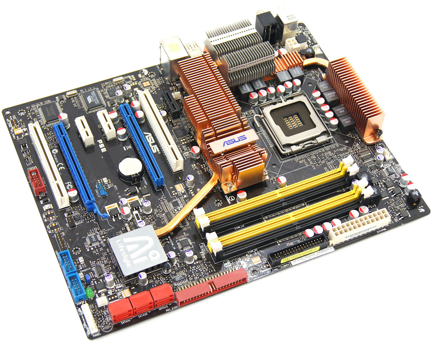 Далее следует ASUS P5E Deluxe, которая благодаря чипсету Intel X48 поддерживает оперативную память стандарта DDR2 вплоть до 1200 МГц, всю линейку процессоров LGA 775 от Pentium 4 5xx/6xx до Core 2 Quad Q6x00/Q9xx0 с частотой FSB до 1600 МГц. Обладает двумя полноскоростными слотами PCI-E 2.0 x16, шестью каналами SATA-II и одним IDE UDMA-133.