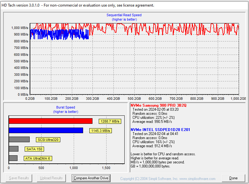 Выше на фото Samsung против Intel на ASUS P5E Deluxe (чипсет Intel X48). Что интересно загрузка процессора во время выполнения теста у Samsung – 22%, а у Intel – 16%. Скорость среднего чтения у Samsung составляет 990.5 МБ/с, у Intel Optane - 912.4 МБ/с.