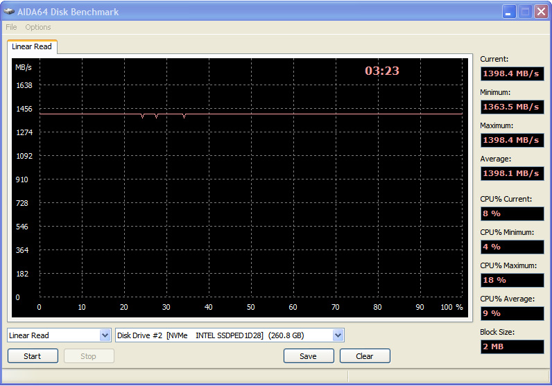 Intel Optane во всей красе! Насколько ровный и красивый график на первой версии PCI-Express и насколько дерганный на второй. Как будто накопитель старается выйти на максимальный рубеж, но что-то его сдерживает. И хотя до потолка пропускной способности 4-х линий PCI-e Gen.2 еще далековато (предел 2 Гб/с), но все же прибавка в скорости хорошо заметна, в районе 46%. Линейного роста в 100% не получилось. Ниже посмотрим на что способен его конкурент на новой платформе.