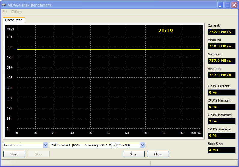 NVMe SSD Samsung 980 Pro. Объем – 1 Тбайт. Заявленные скорости производителем: около 7000 Мб/с на чтение и 5000 Мб/с на запись. Используемая версия накопителя с оригинальным радиатором устанавливалась в PCI-Express M2 SSD адаптер с четырьмя линиями PCI-Express.