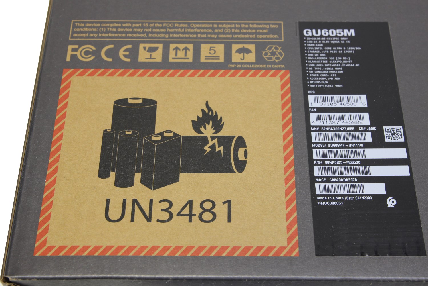 На противоположной поверхности есть только стандартное предупреждение об аккумуляторах и наклейка с указанием модели и комплектации.