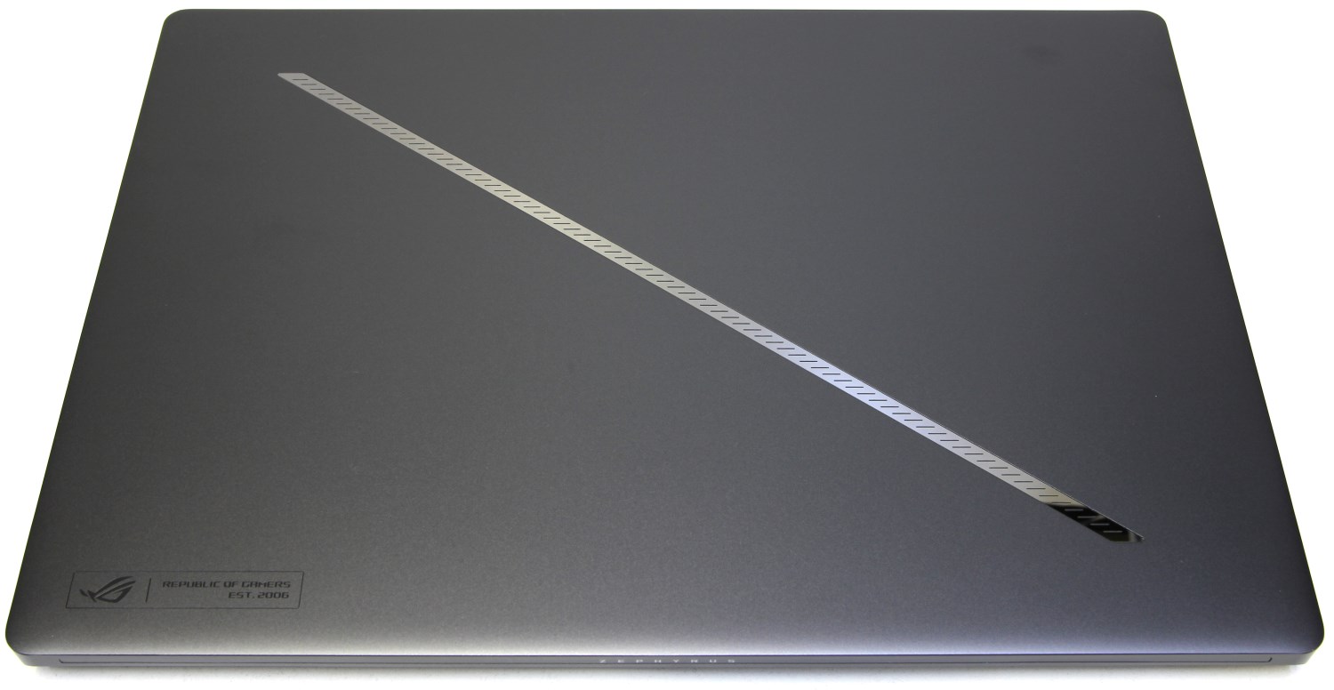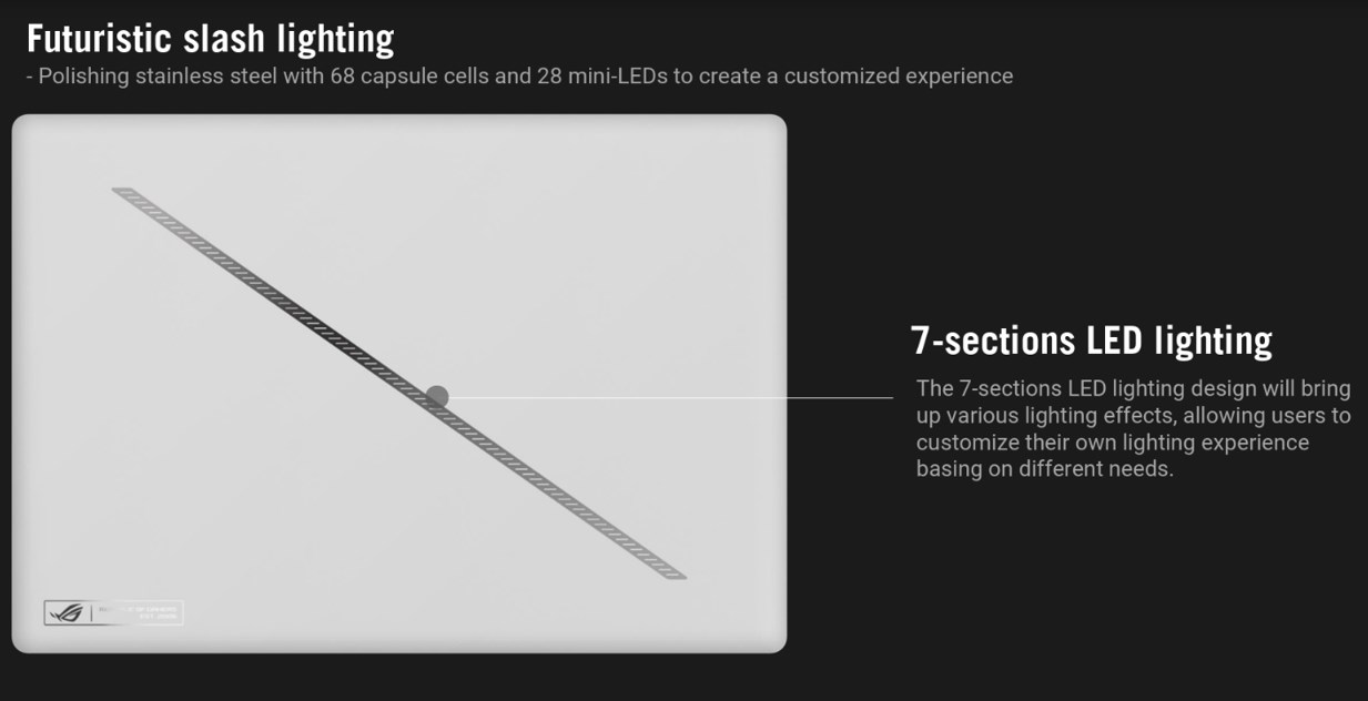 Производитель каждый раз придумывает с оформлением что-то новенькое, вот и в этот раз они постарались и добавили на верхнюю крышку специальную диагональною полосу. Непосредственно на крышке пользователи найдут секцию светодиодной подсветки под названием «Slash Lighting», которая, как и известный дисплей AniMe Matrix предыдущих моделей Zephyrus, позволяет пользователям настраивать схемы освещения в соответствии со своими потребностями. Пользователи могут отключить эту функцию, если хотят сохранить более утонченный внешний вид.