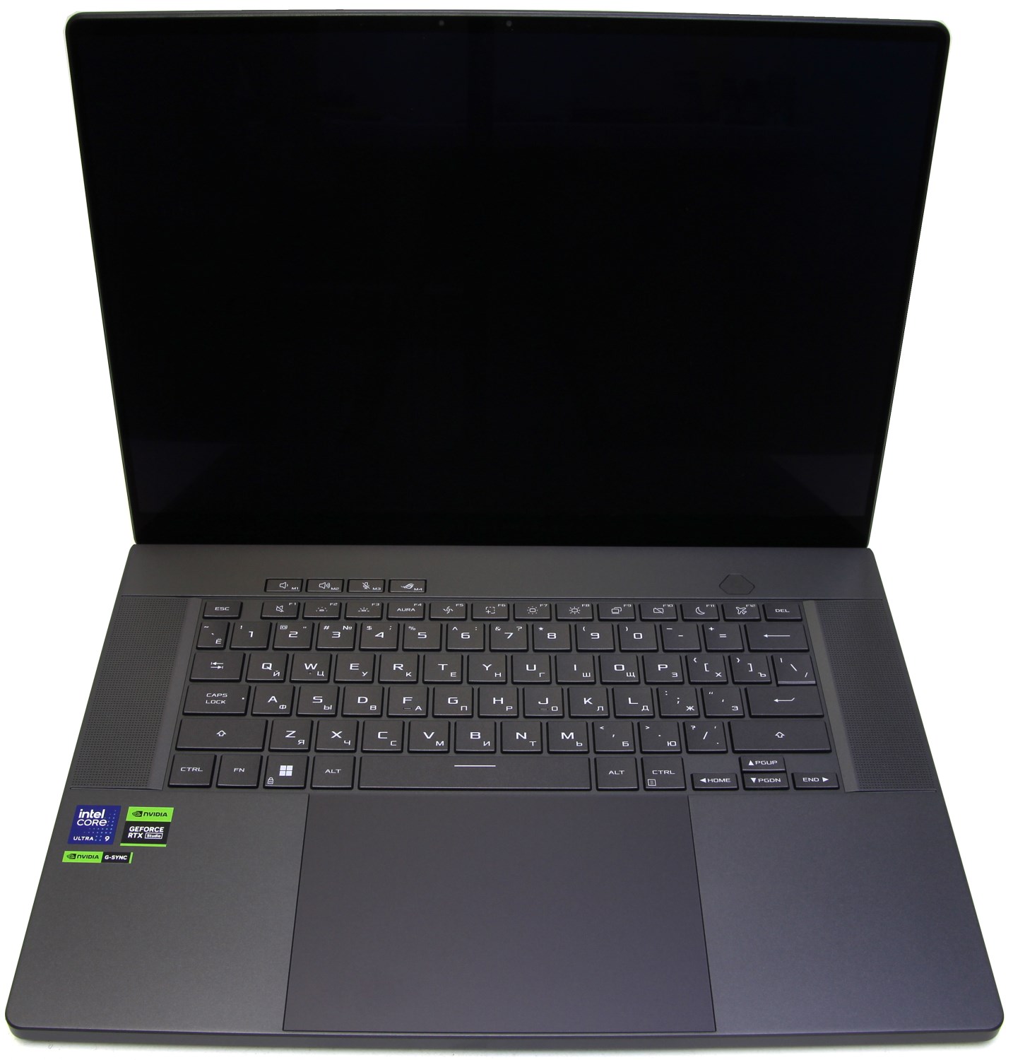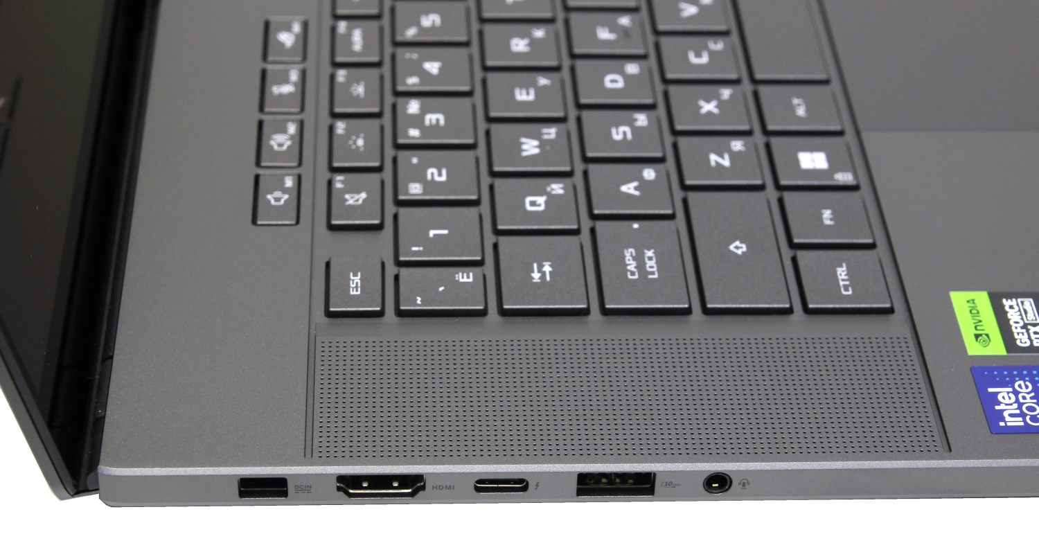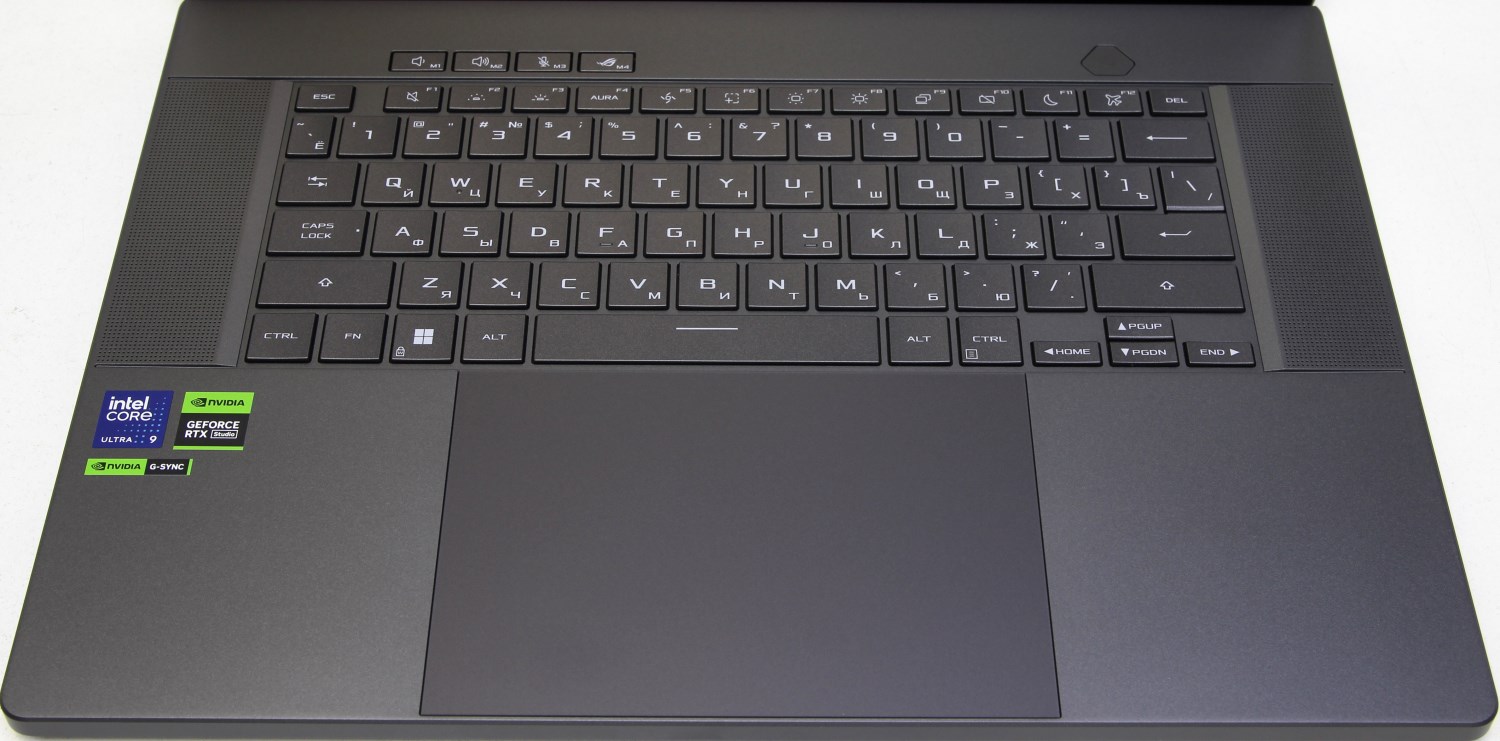 Ноутбук крупный, но клавиатура здесь без цифрового блока и его нет даже в крупном тачпаде. Можно было бы реализовать NumberPAD, но производитель решил, что ноутбук игровой, а значит цифровой блок не нужен. Сама клавиатура также была обновлена. Цельный алюминиевый корпус увеличивает жесткость до 24 % по сравнению с моделью 2023 года, что приводит к меньшему изгибу клавиатуры. Слева и справа от клавиатуры расположены фронтальные динамики, для которых проделаны 4110 отверстий в корпусе.