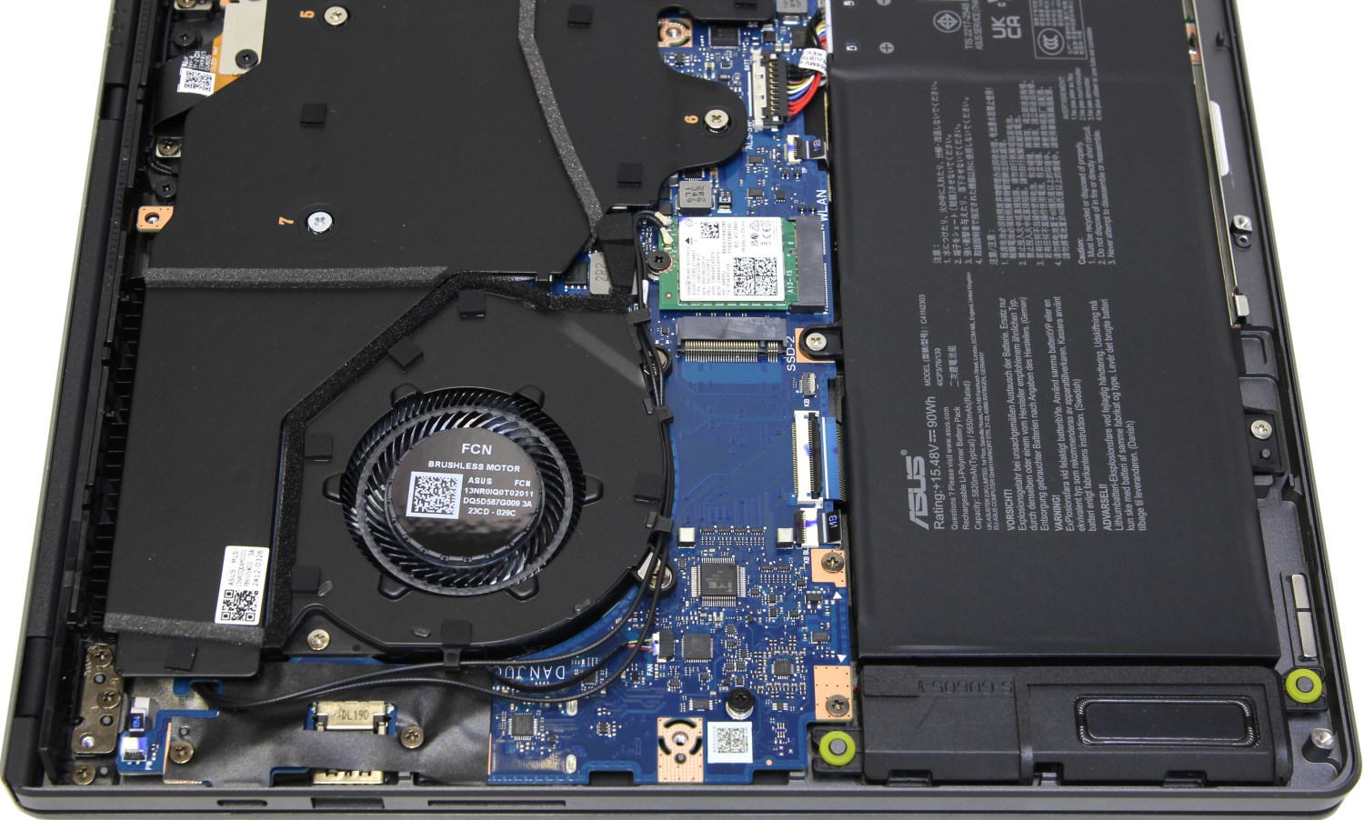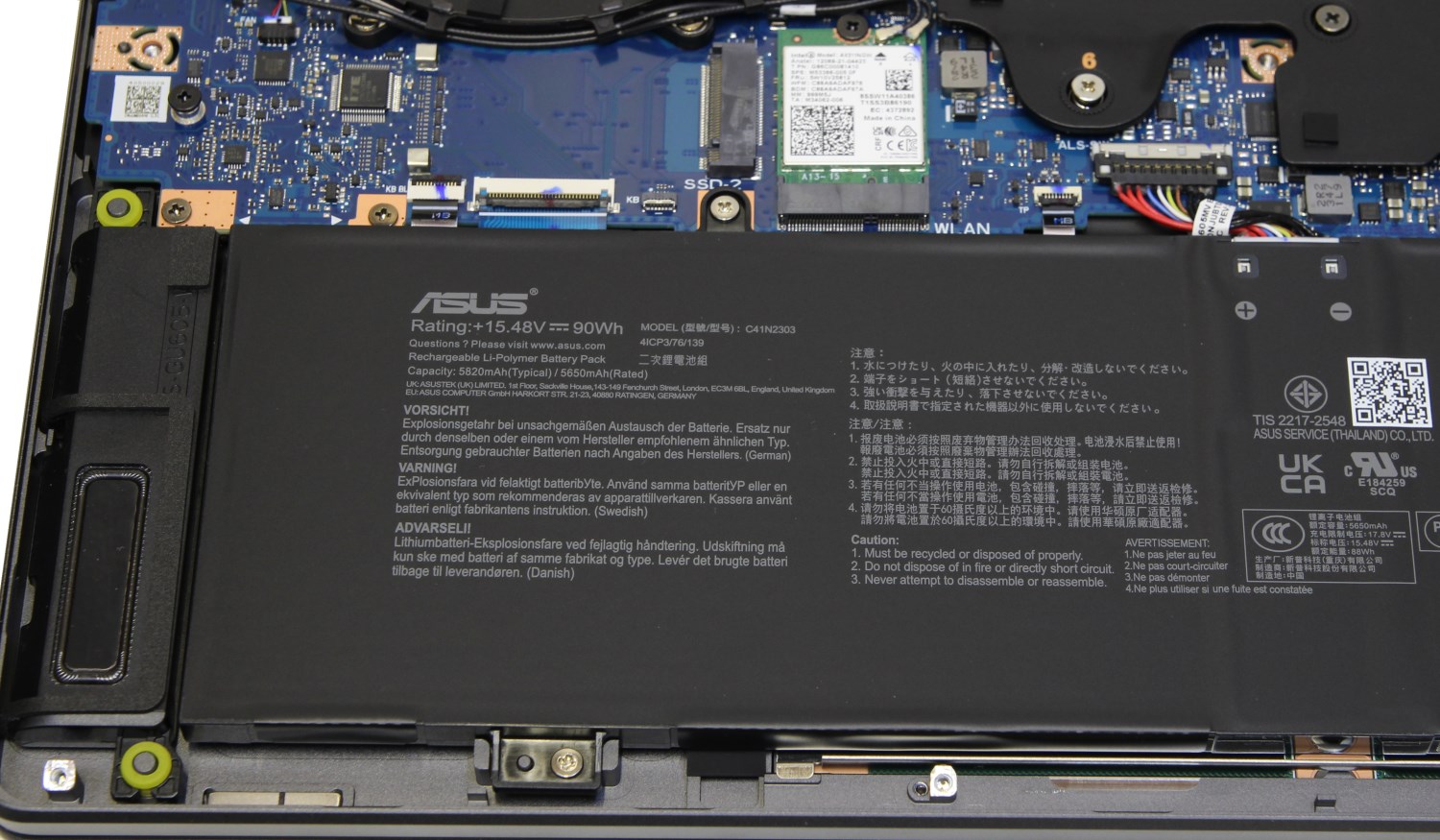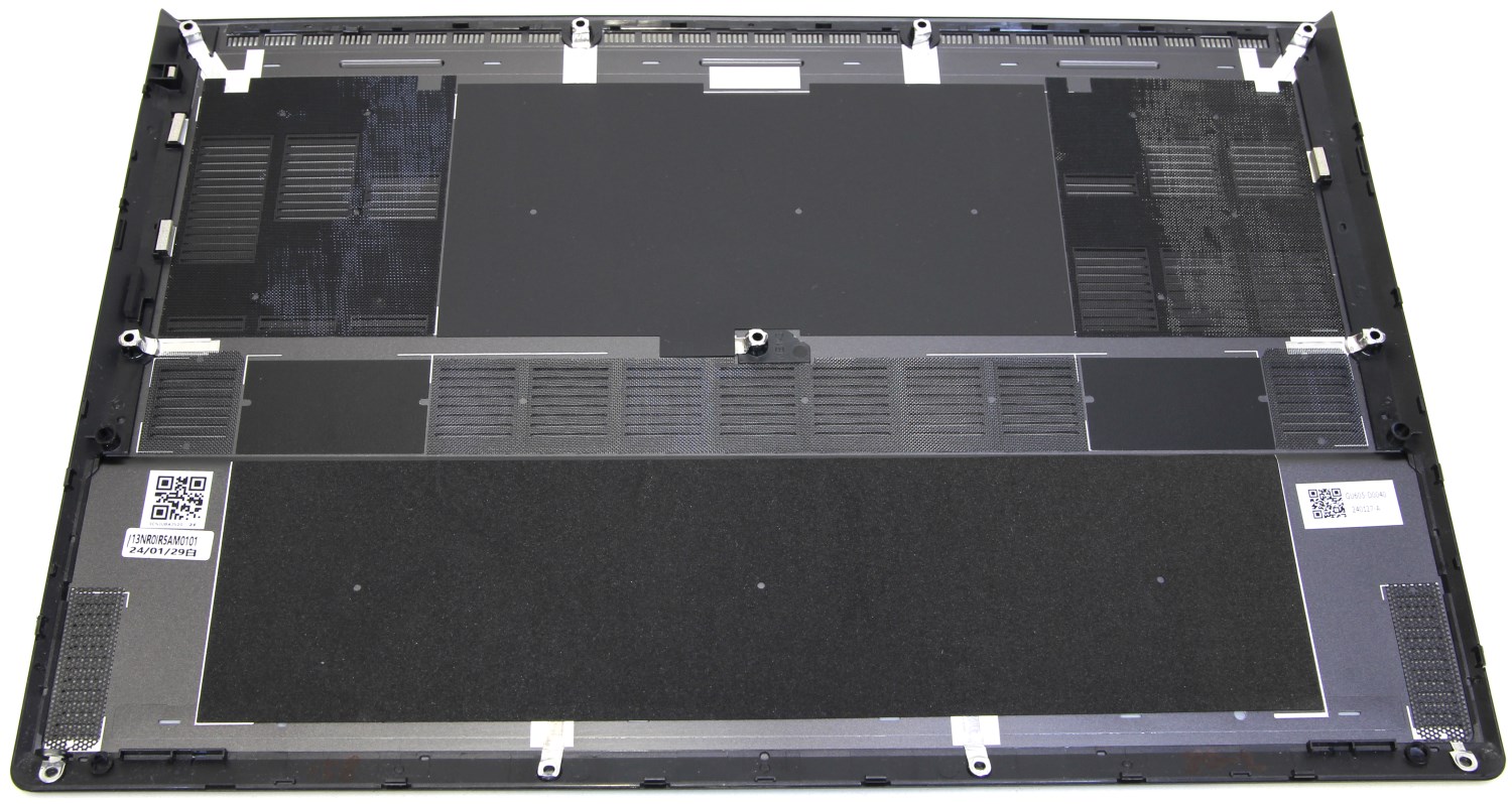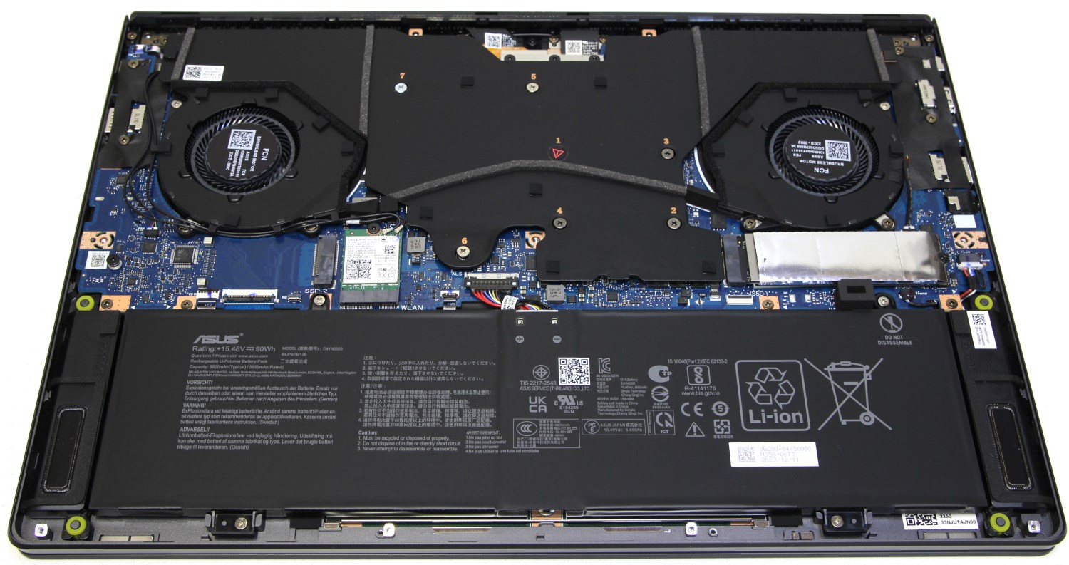 Аккумулятор здесь всего на 90 Вт*ч. Число солидное для какого-нибудь компактного устройства, а здесь это просто как встроенный ИБП. Возможности апгрейда ограничены только заменой или установкой дополнительного твердотельного накопителя. Оперативная память полностью распаяна на самой плате и увеличить её объём не получится. Здесь используются чипы LPDDR5X с частотой 7467 МГц. Отдельно в модулях я память такого типа не встречал, поэтому ситуация понятная. Сами чипы находятся под системой охлаждения, которую я не стал демонтировать из-за сложностей с термоинтерфейсом.