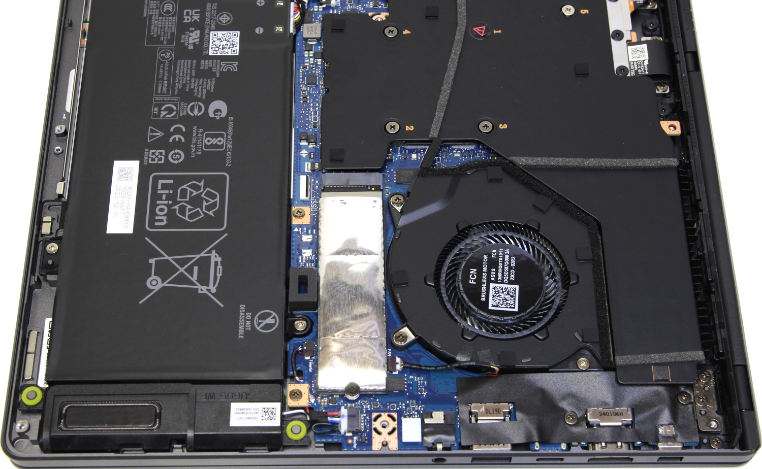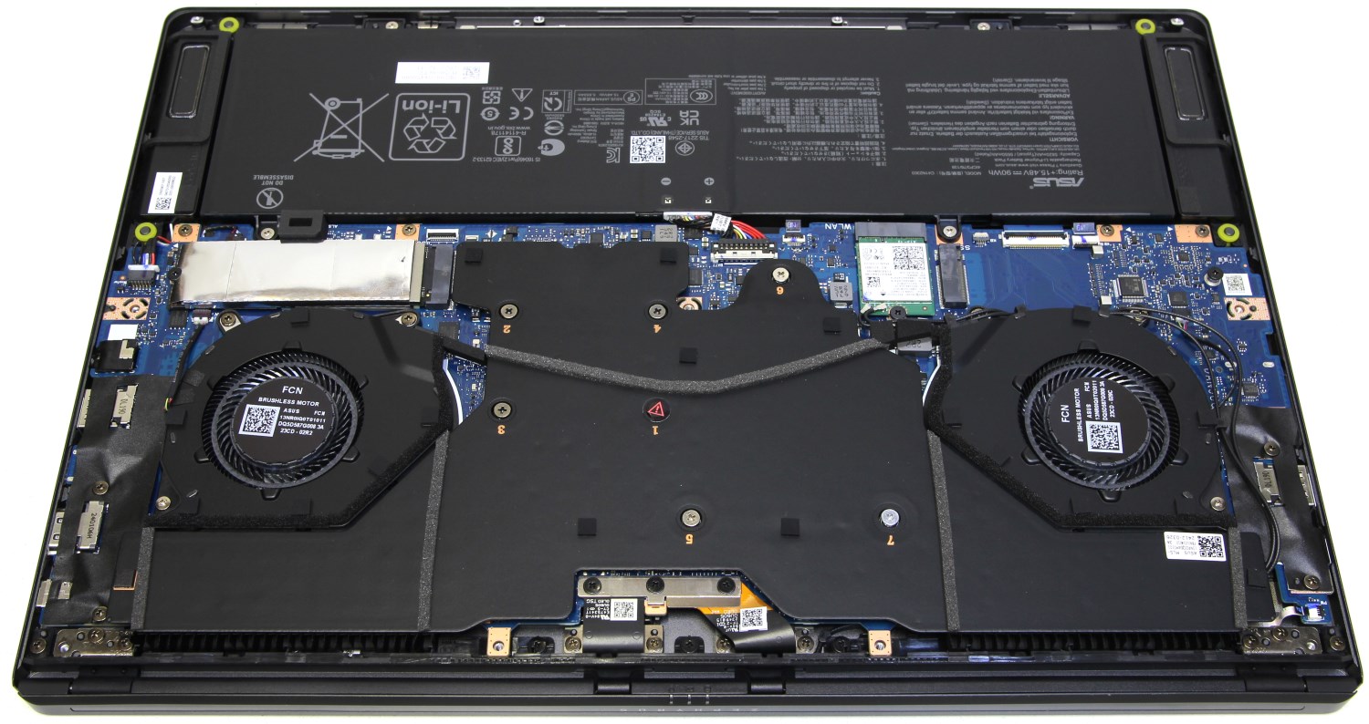 Модель относительно компактная, поэтому свободного места тут практически нет. Много пространства занимает система охлаждения и аккумулятор. В этом нет ничего удивительного потому, что у данного устройства очень мощная начинка. Всё дополнительное пространство заклеено чёрной плёнкой.