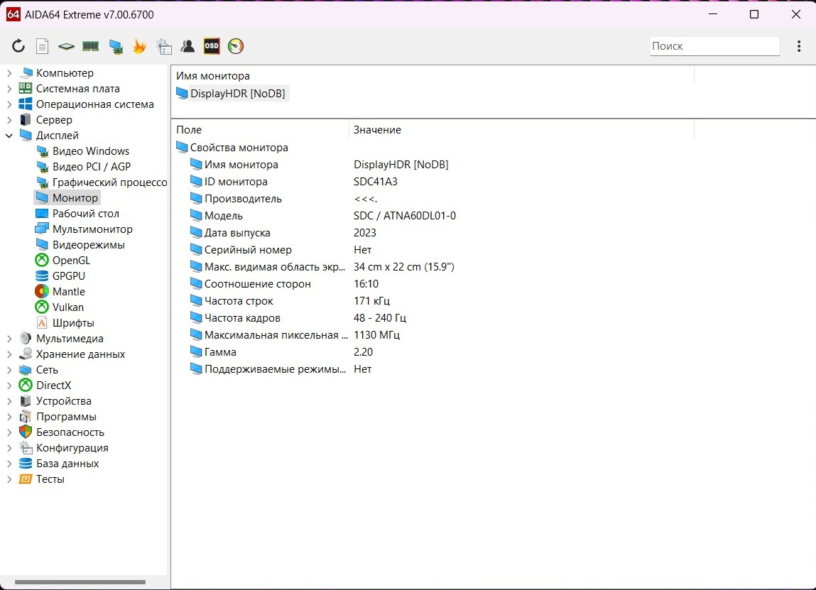 Дисплей с диагональю 16,0 дюймов обладает разрешением 2560 х 1600 точек – наиболее оптимальный вариант для гейминга. Поверхность экрана глянцевая. Zephyrus G16 может быть оснащен либо OLED, либо TFT дисплеем. В обоих случаях он соответствует всем требованиям стандарта дисплея ROG Nebula. В моей версии установлен флагманский OLED экран фирмы Samsung, модель ATNA60DL01-0, частота обновления 240 Гц. Стоит такая матрица как простенький ноутбук.
