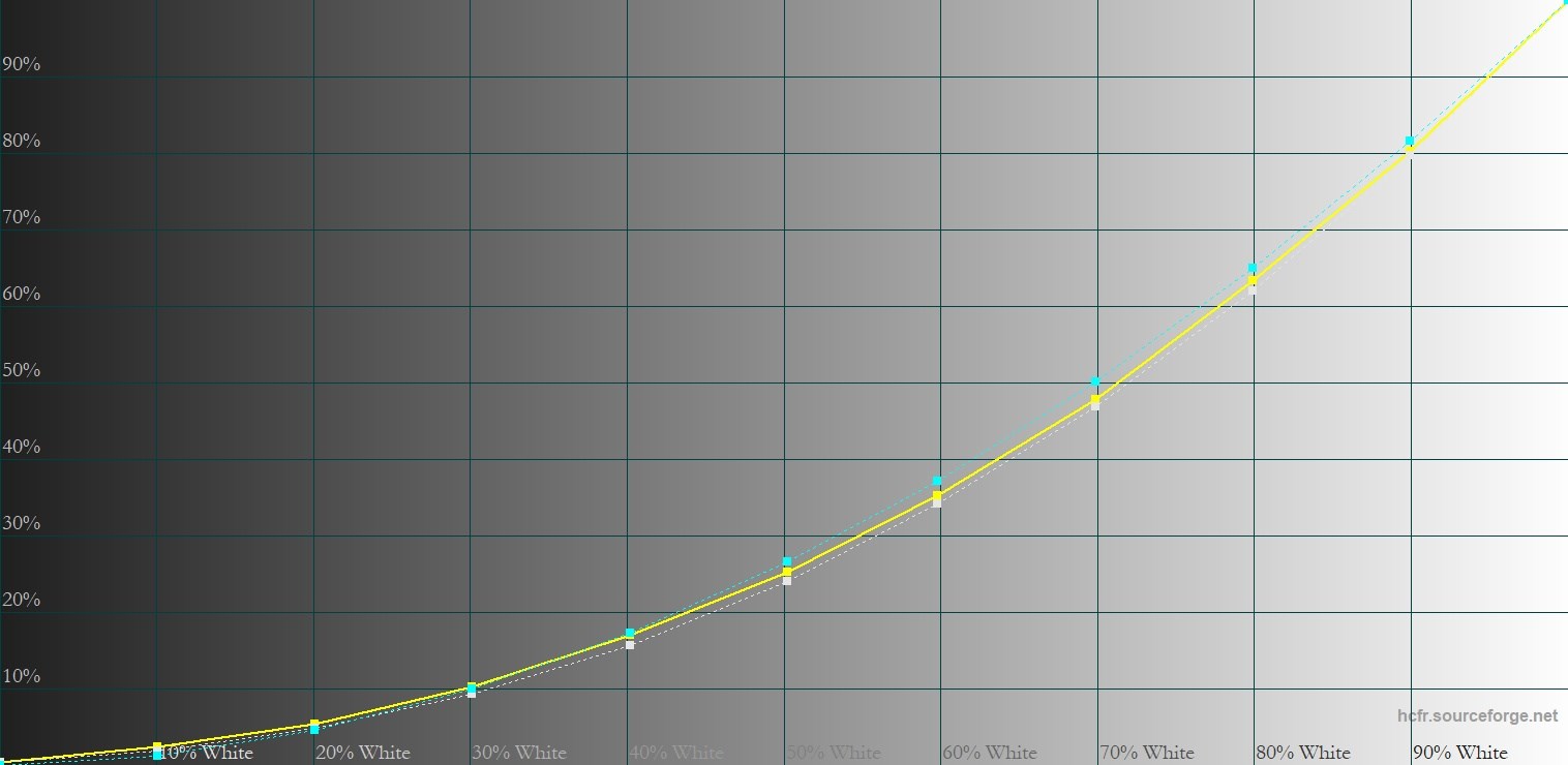 Можно заметить, что экран очень яркий. Даже в солнечную погоду на улице получается очень комфортно. Яркость регулируется в достаточно большом диапазоне, а сам дисплей показывает хороший уровень контрастности. Благодаря антибликовому покрытию отсутствуют паразитные засветки даже при использовании на улице. Все графики точно совпадают друг с другом, но достаточно заметно отклонились от референса. Впрочем, нельзя назвать это критичным.