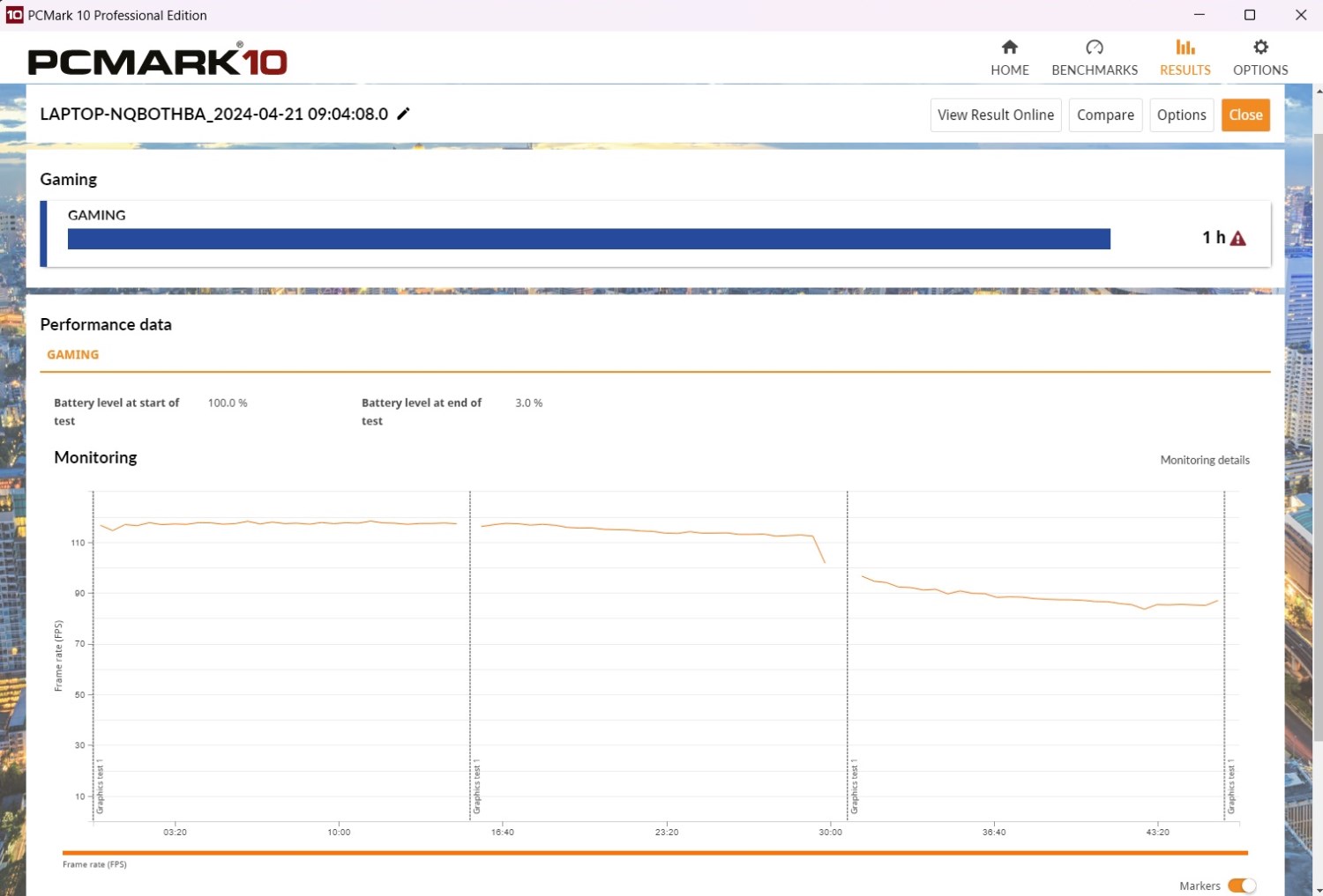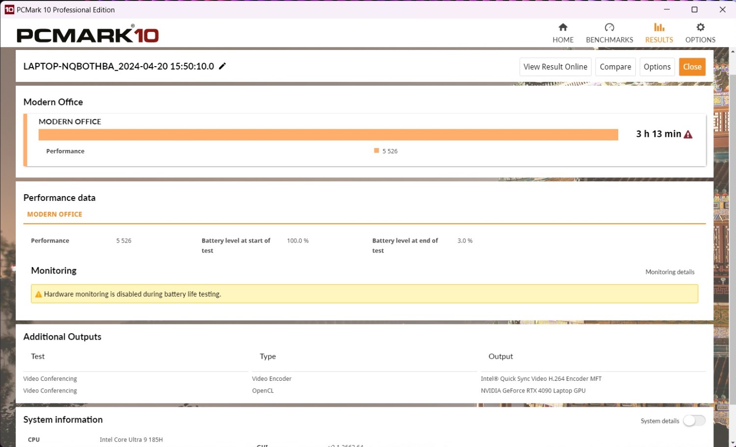 Играть от аккумулятора долго не получится. Тестовый пакет PCMark с предустановкой Gaming работает немногим более часа. Зато тест Modern Office, который эмулирует работу в офисных приложениях демонстрирует работу в 3 часа и 13 минут.