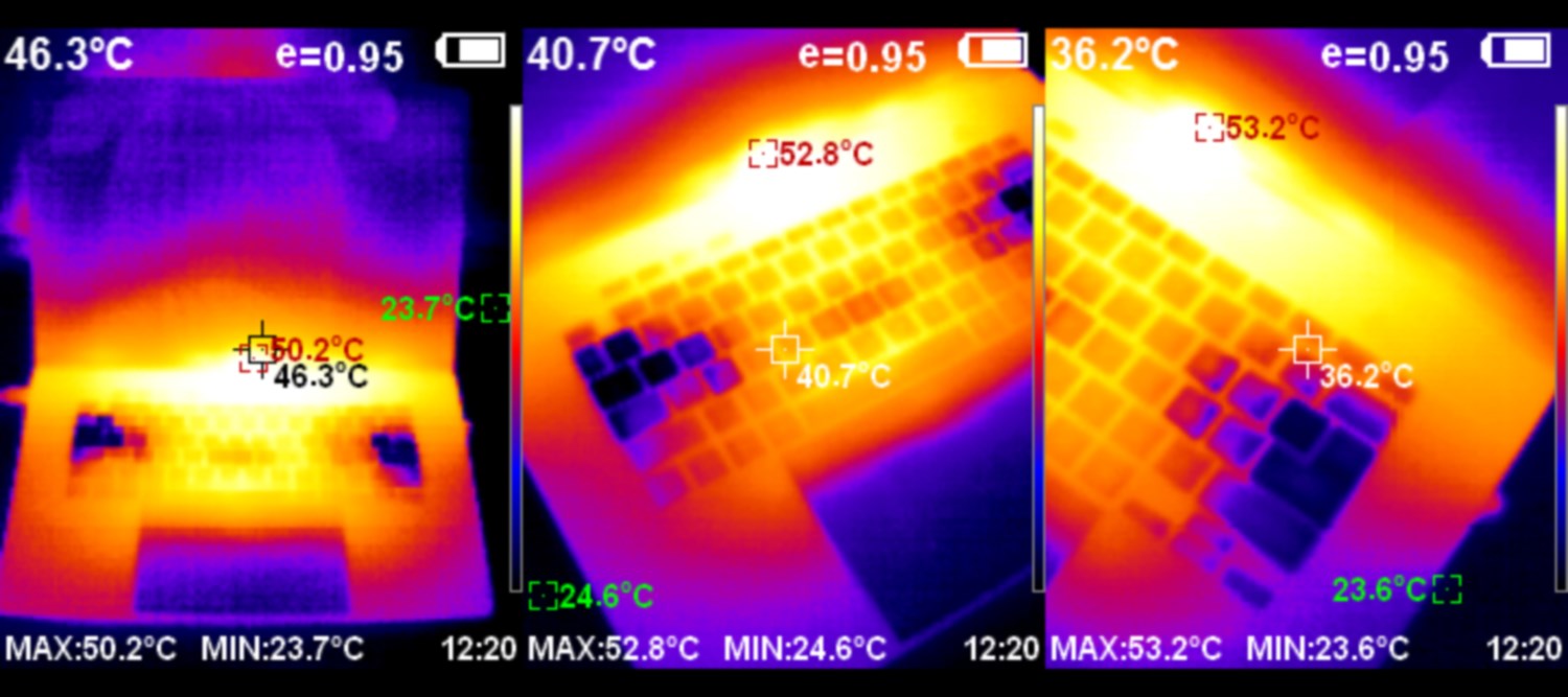 Нагрев устройства достаточно умеренный. Даже при использовании самых тяжёлых приложений: Prime95 и Furmark температура клавиатуры не поднимается выше 37С, но можно заметить, что, нагрев не равномерный, а основная часть горячего воздуха выходит перед экраном внизу.