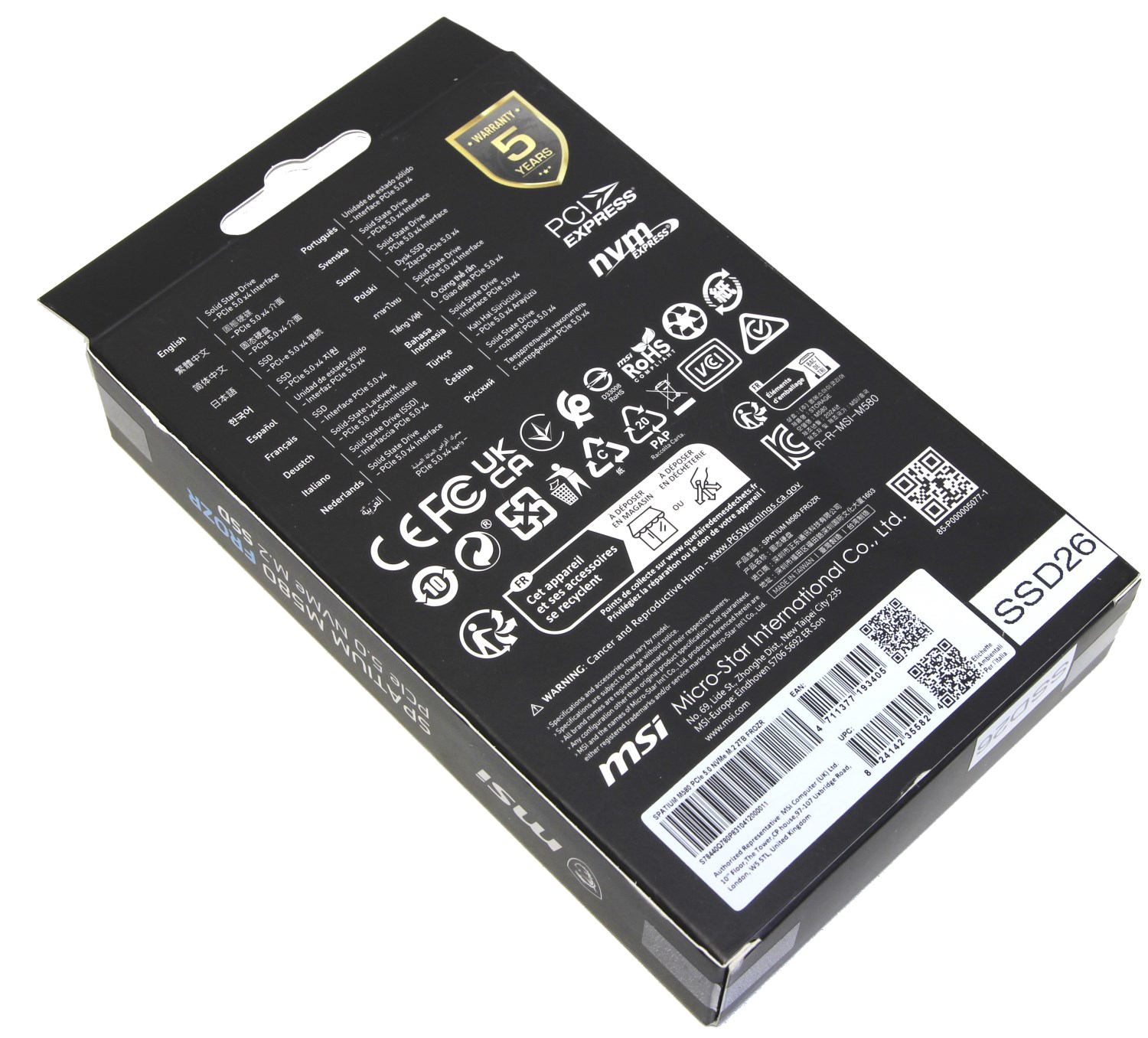 Внизу указано, что это PCI-e 5.0 NVMe M.2 накопитель с радиатором называется Spatium M580 с приставкой Frozr. С обратной стороны информации представлено гораздо больше.