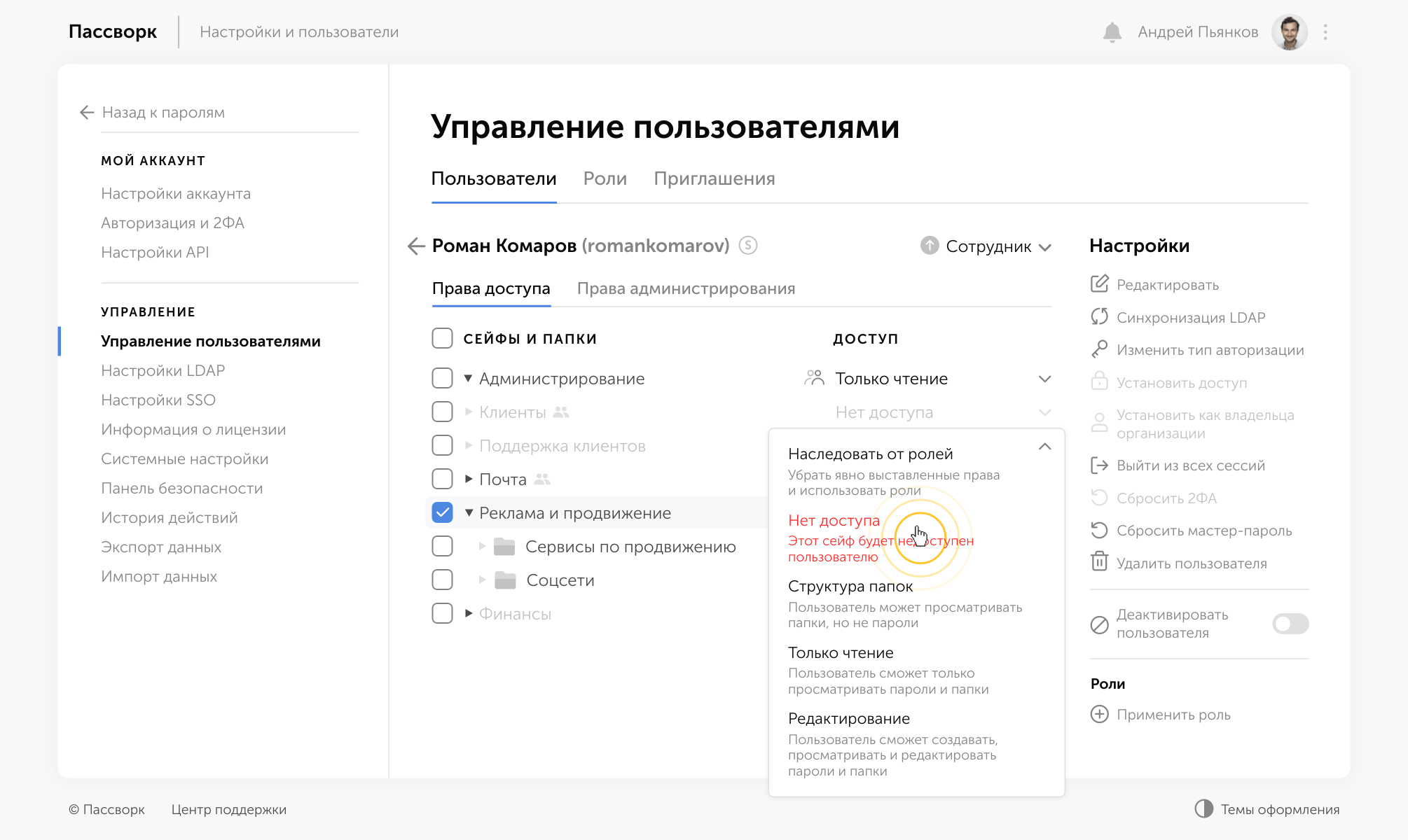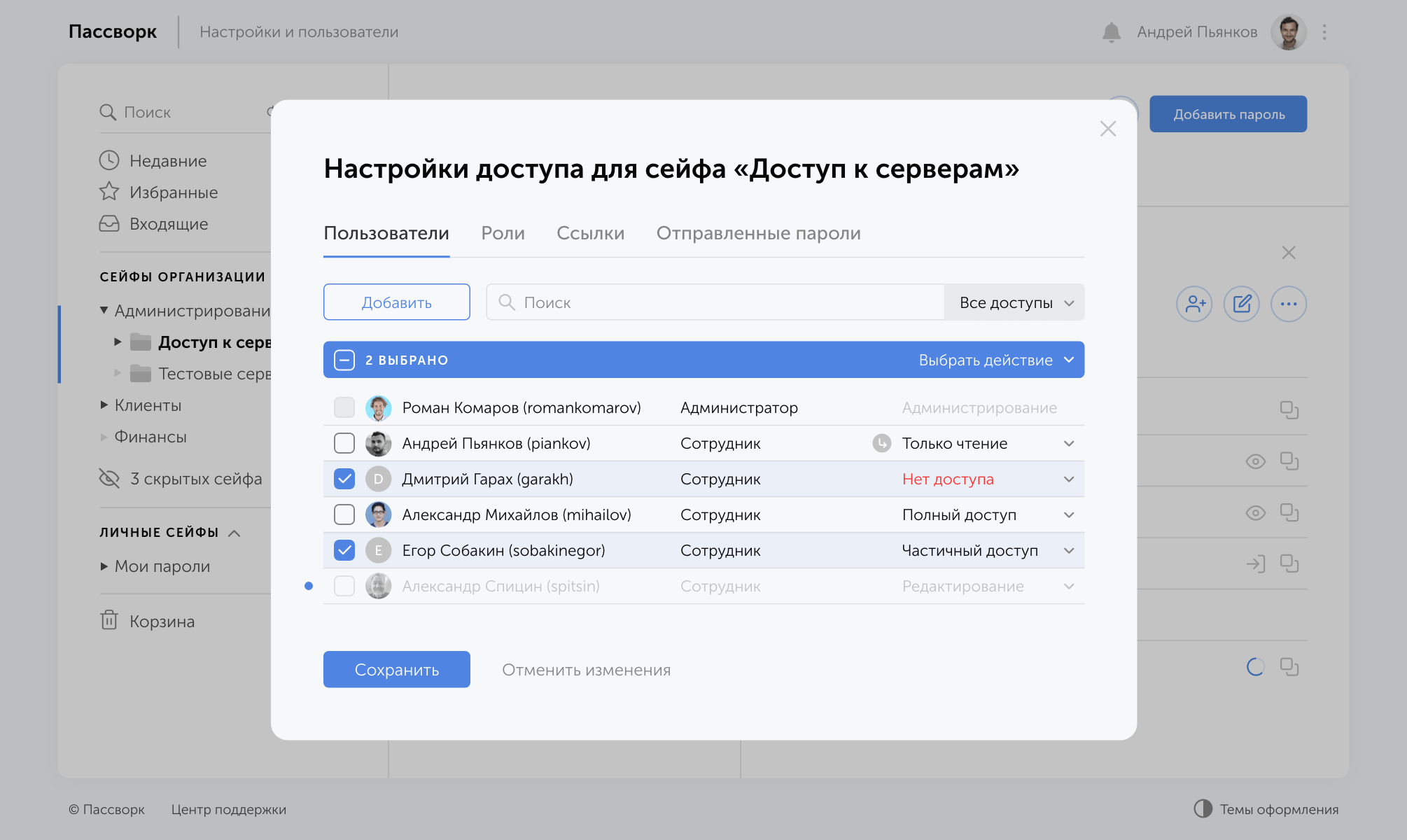 Интерфейс Пассворка прост и понятен, но при этом содержит много возможностей. ПО работает быстро. Система разграничения прав доступа позволяет безопасно переслать пароль в виде ссылки, либо поделиться им напрямую внутри системы.