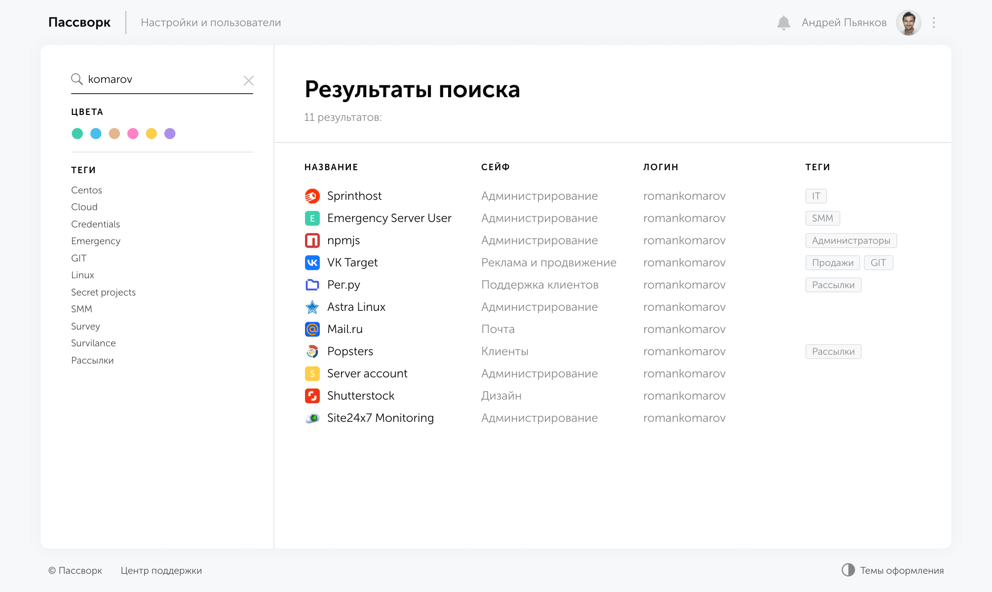 Пассворк упрощает работу с корпоративными паролями. Все данные безопасно хранятся в удобном структурированном виде, а сотрудники быстро находят нужные пароли. Правами пользователей управляет администратор, который отслеживает все действия, а также проводит аудит безопасности.