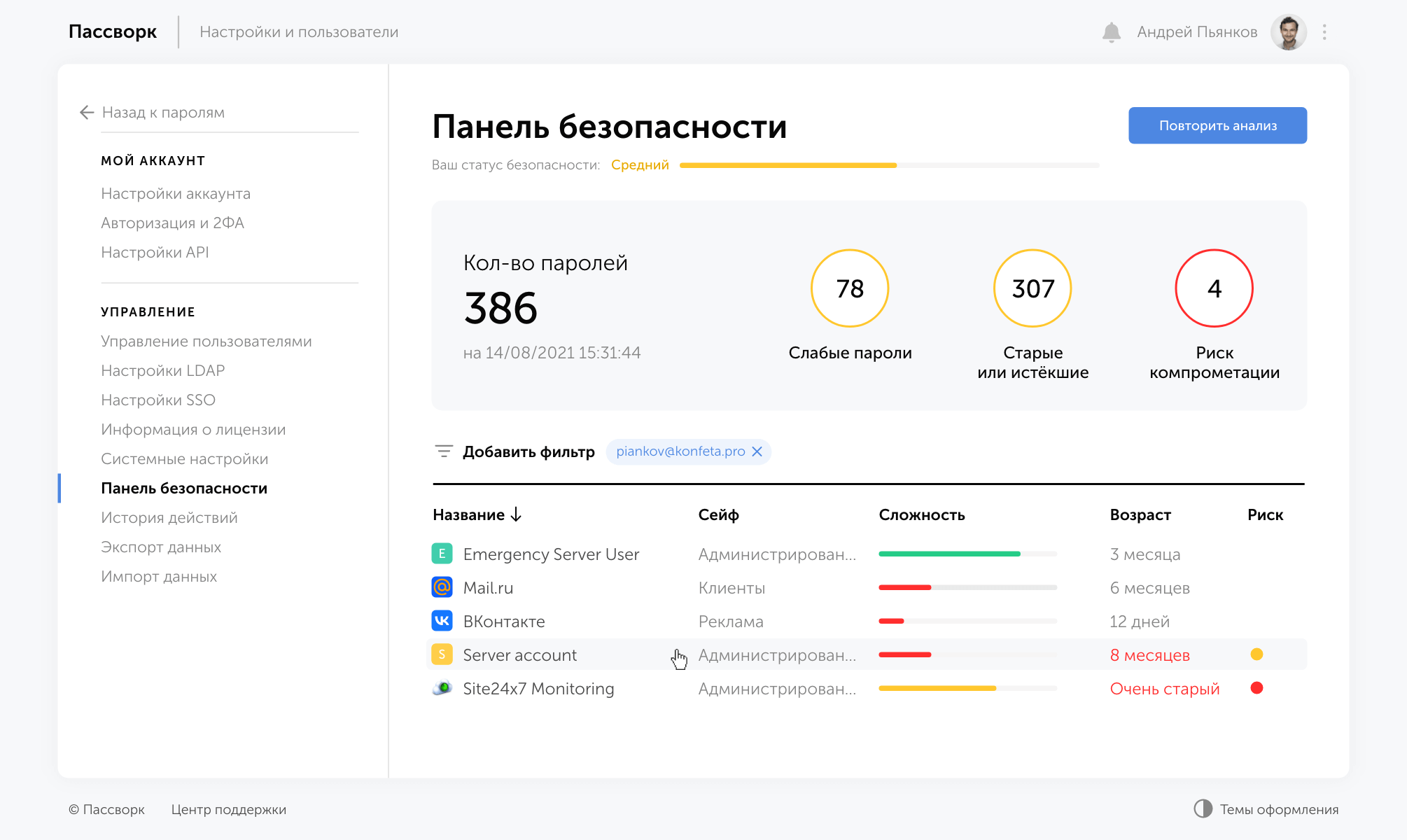 Если пароль слишком простой, устарел или скомпрометирован, то система вовремя предупредит вас. Это позволяет поддерживать необходимый уровень безопасности.