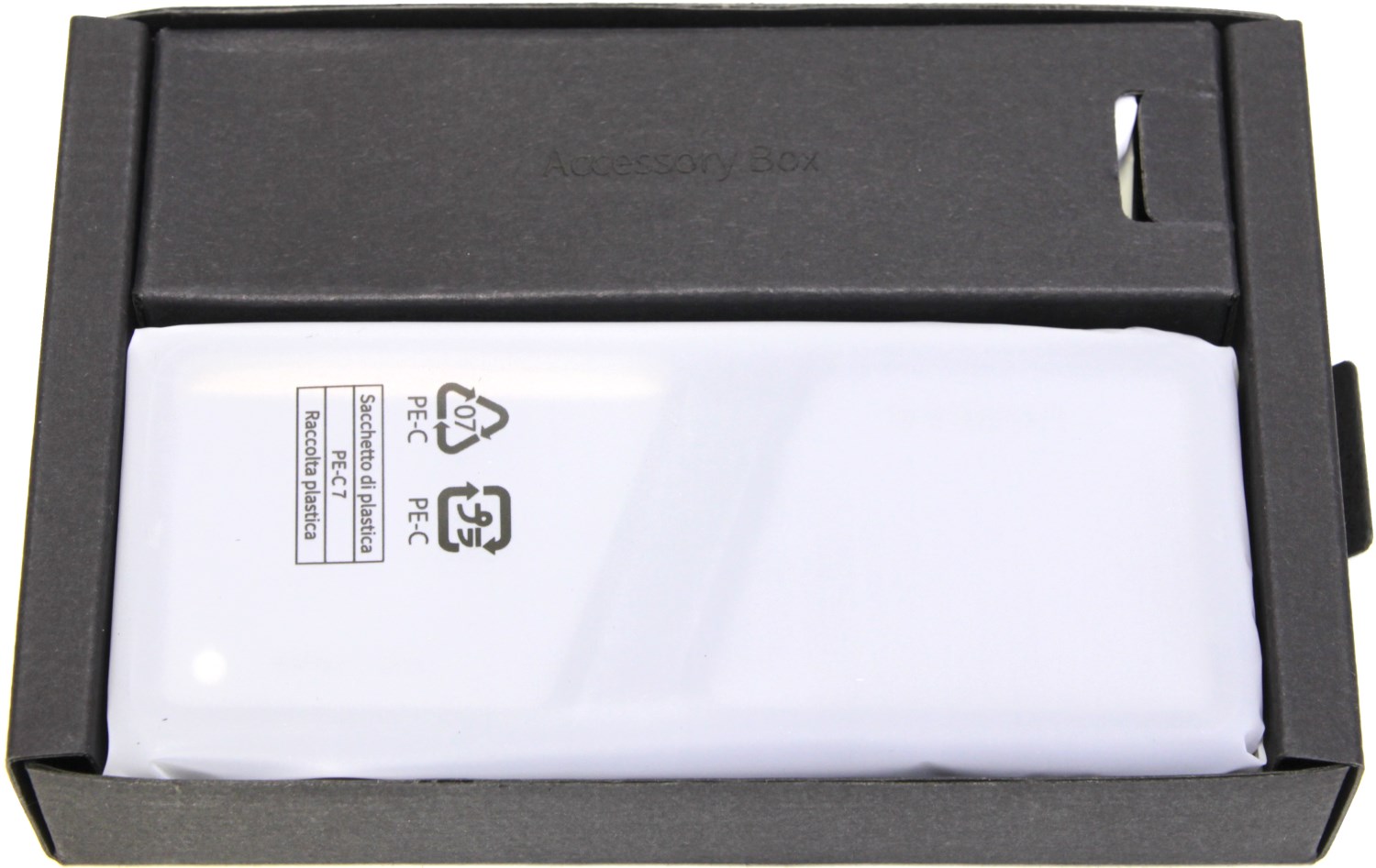 Внутри коробки находится чёрный картонный лоток. Он тоже достаточно плотный, поэтому в целом защита тут хорошая. Здесь мы видим небольшую чёрную коробочку с комплектом поставки и само устройство, находящееся в белом пакете.