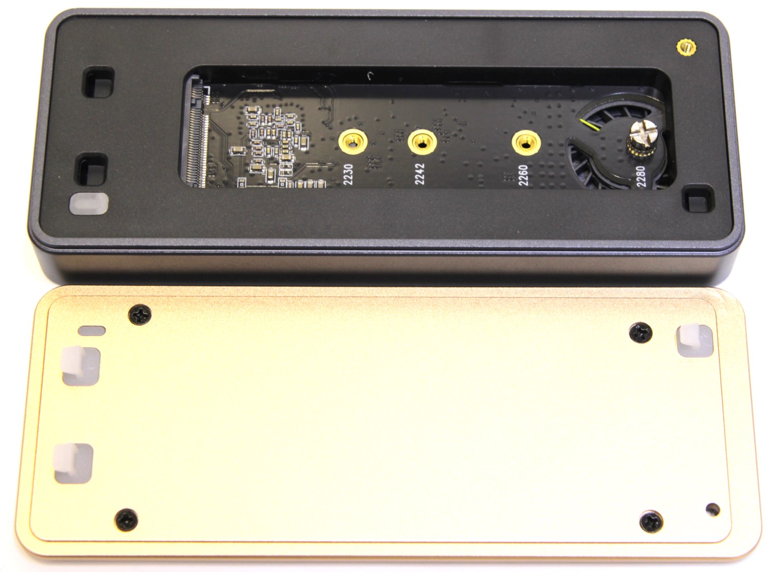 Особое внимание уделено охлаждению потому, что быстрые SSD M.2 накопители склонны к высокому нагреву. Поэтому производитель не только сделал корпус из алюминия, чтобы устройство лучше охлаждалось, но и добавил небольшой вентилятор для тех случаев, когда температуры будут совсем критичными. Я такого не наблюдал, поскольку накопители на базе контроллера MAXIO MAP1602 не очень горячие, но и скорость их совсем не рекордная. Здесь же скрывается ещё один жирный плюс – пользователь сам вправе выбрать то устройство, которое ему будет необходимо для работы.