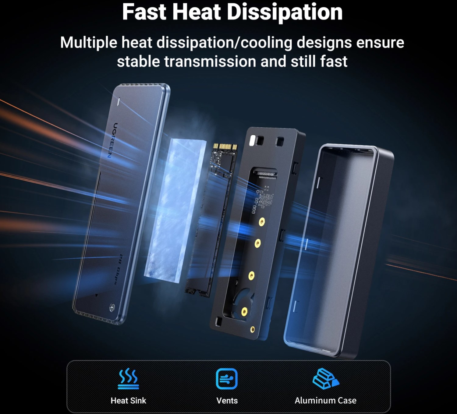 Ugreen CM642 позволяет создать быструю и универсальную убер-флешку, которая может соперничать по скоростям с интерфейсом PCI-e Gen3 x4, что для портативного устройства, выполняющего функцию передачи данных, очень круто. Кому это может пригодиться? Сегодня можно переносить огромные объёмы данных, содержащих видео высокого разрешения или массивные проекты. Для этих целей устройство подходит идеально, причём оно обеспечивает не только высокую скорость, но и надёжность. Для этого предусмотрен массивный корпус из алюминия и каркас из резины, который защищает рёбра устройства от механических воздействий при падении. Всё сделано максимально просто и продумано.