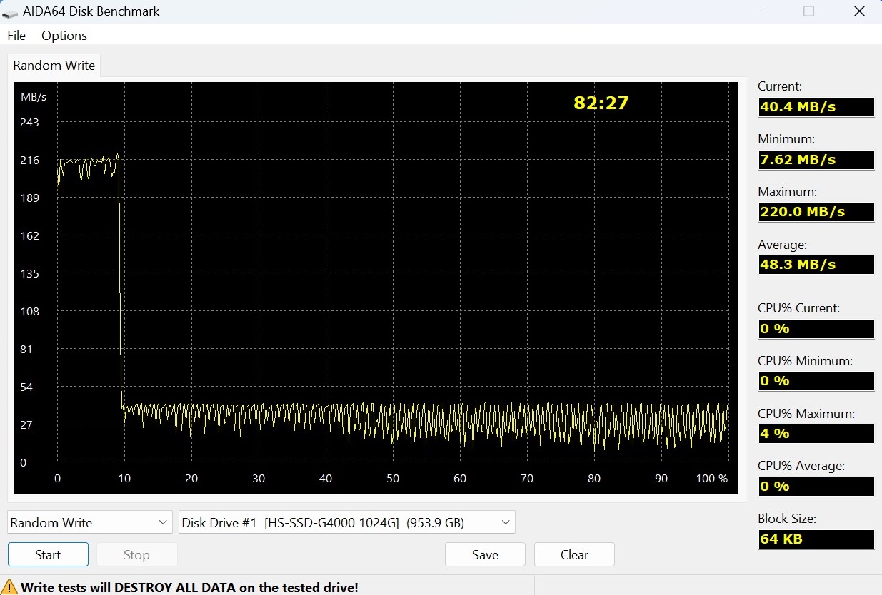 Далее, когда остаётся где-то 60 Гбайт, скорость заметно падает. Похоже, что у безбуферного накопителя просто заканчивается SLC кэш. Поэтому нужно ещё правильно подобрать накопитель. Можно было бы всё это списать на троттлинг, но температура контроллера не поднимается выше 73°C.