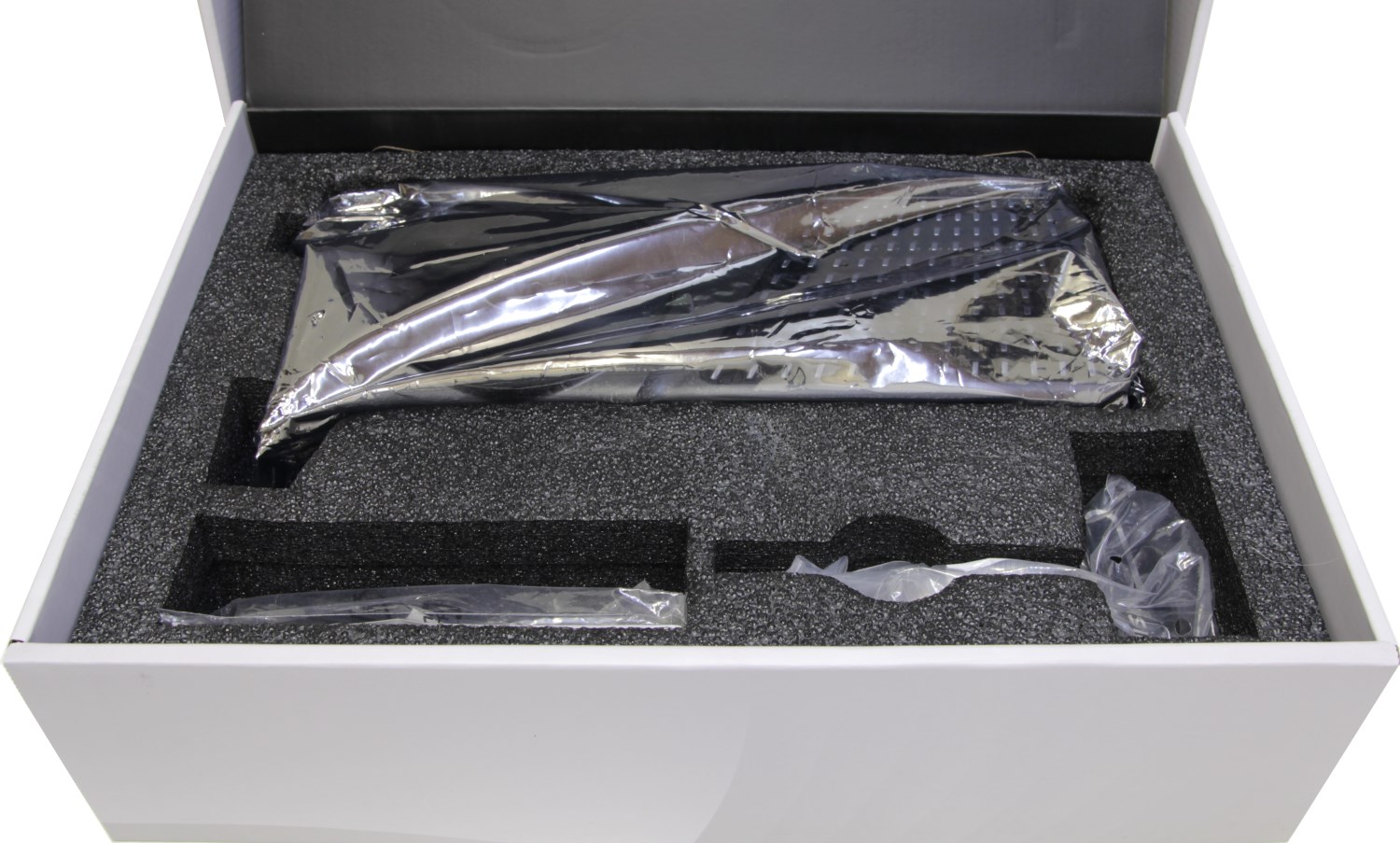 После открытия коробки обнаруживается каркас из вспененного полиэтилена, где основное пространство занимает видеокарта и ещё есть отсеки для остального комплекта поставки. Бумажки находятся в нише под видеокартой.