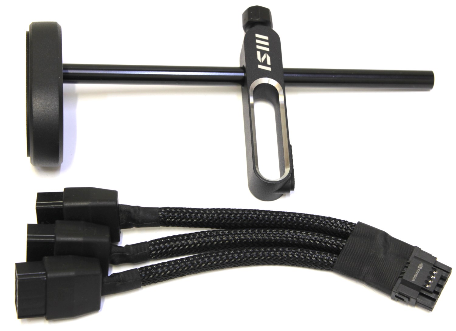 Комплект поставки очень скромный. Есть лишь штанга для поддержки видеокарты, при установке её в горизонтальном положении, а также переходник питания 12VHPWR на три линии 8-pin PCI-e.