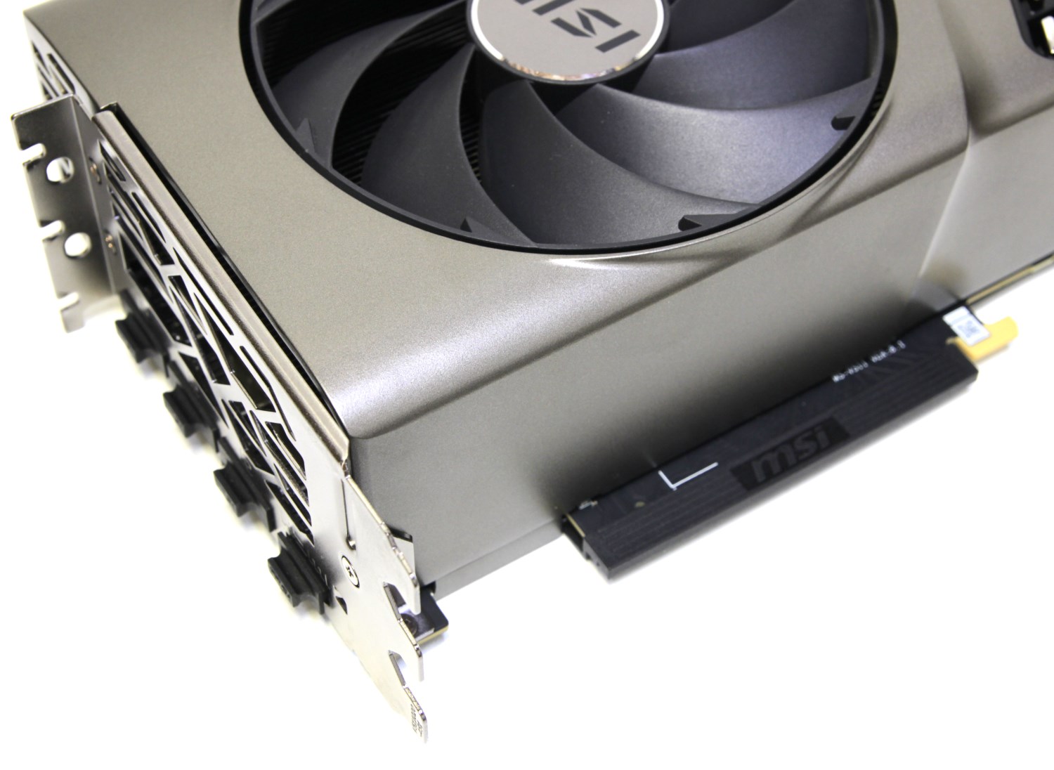 В левом верхнем углу находится логотип компании MSI. Он, как и надпись Expert, выполнен так, что переливается всеми цветами радуги. Справа внизу находится вставка с указанием модели графического процессора.