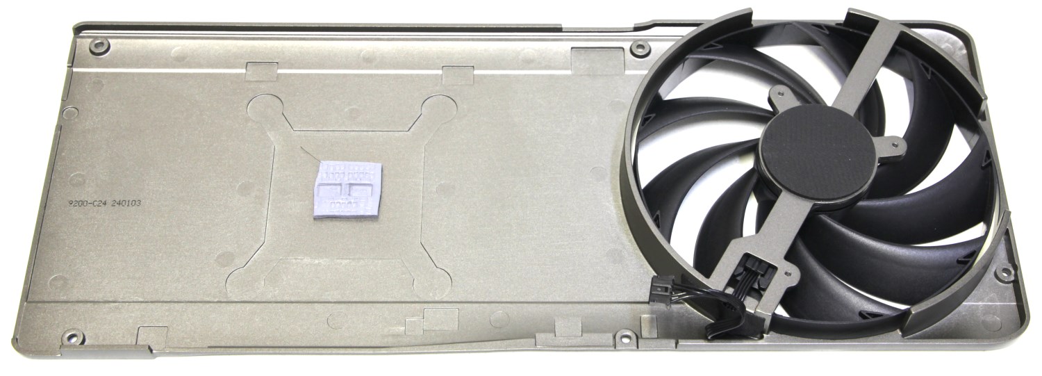 При этом сзади все элементы крепления и тыльная сторона печатной платы в области графического процессора также закрыты, что, казалось бы, должно негативно сказываться на теплоотводе. Однако, сняв эту заднюю пластину, видно, что как раз в этой области находится термопрокладка, которая передаёт всё тепло с обратной стороны