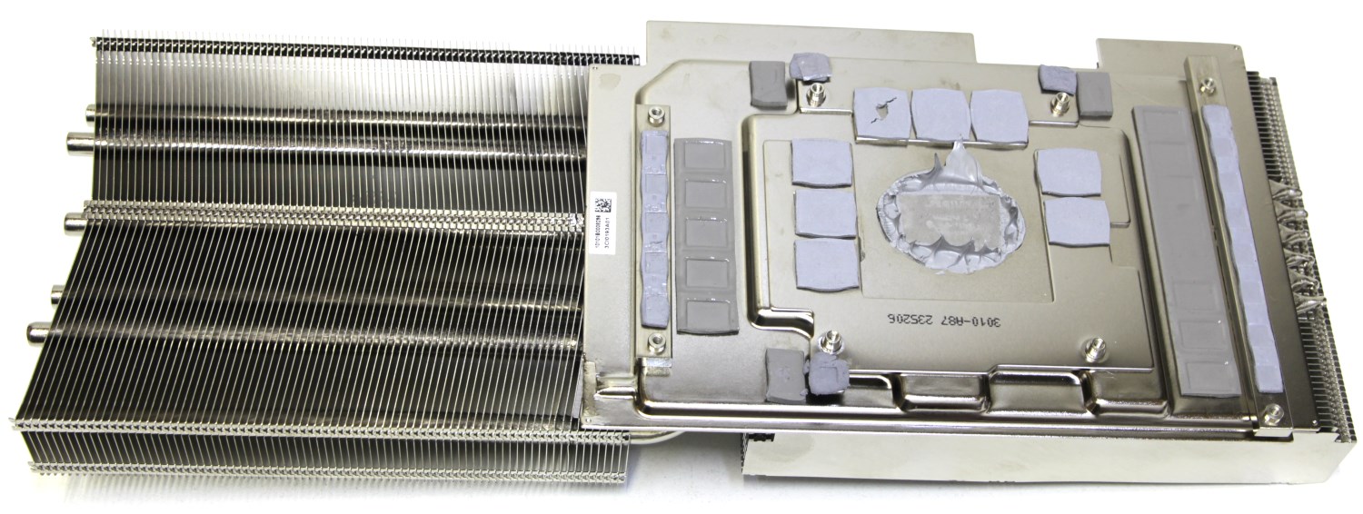 Также прямо сверху испарительной камеры припаян массив алюминиевых пластин, расположенных горизонтально. Воздух, проходя через них, должен выходить за пределы корпуса через отверстия в задней пластине с видеовыходами. Над этой частью радиатора находится другой более производительный вентилятор, обеспечивающий большее давление, чтобы прогнать поток через более плотный радиатор. Также на радиаторе есть пластины для контакта с транзисторными сборками и катушками индуктивности. Контакт осуществляется через терморезинки.