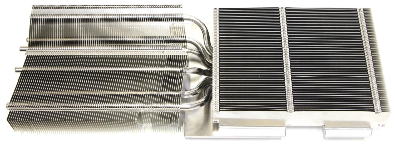 Конструкция радиатора весьма необычная. В основании находится огромная испарительная камера. В верхней её части припаяно шесть медных никелированных тепловых трубок диаметром 6 мм, которые идут вправо и образуют отдельную секцию радиатора для вентилятора, который находится на задней пластине. Трубки пронизывают большое количество алюминиевых пластин, которые расположены вертикально.