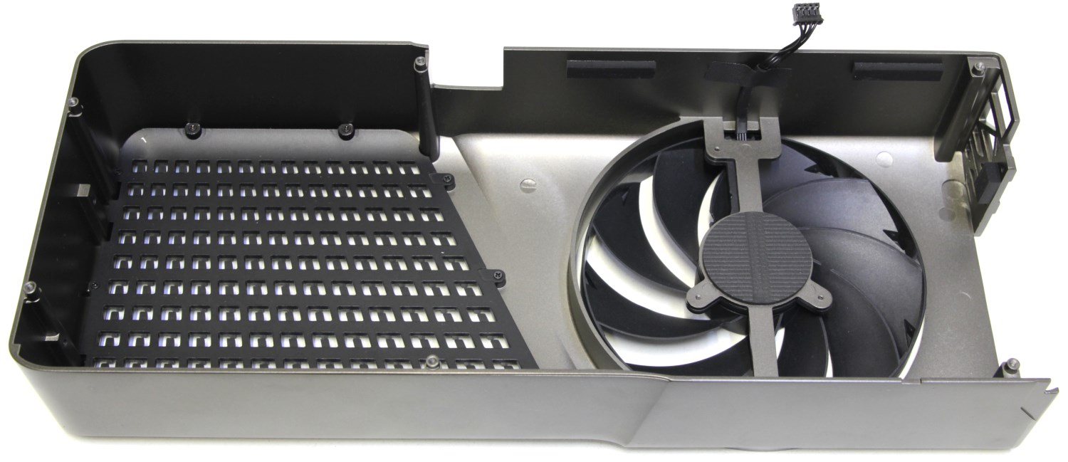 Габариты меньше, а карта тяжелее и это не удивительно. Пластиковые только лопасти у вентилятора. Кожух и задняя пластина металлические. Металл дополнительно окрашен серебристой краской. Поверхность матовая.