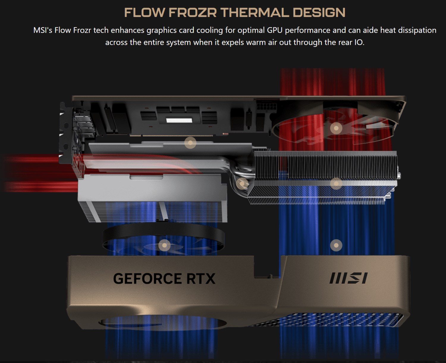 Компания MSI тоже решила немного поэкспериментировать, но делать это самостоятельно, не вступая в какие-либо коллаборации. Вдохновением послужил эталонный дизайн видеокарт NVIDIA, где один вентилятор находится спереди, а другой сзади. Пока компания MSI представила одну такую карту, которая называется MSI Expert RTX4080 Super.
