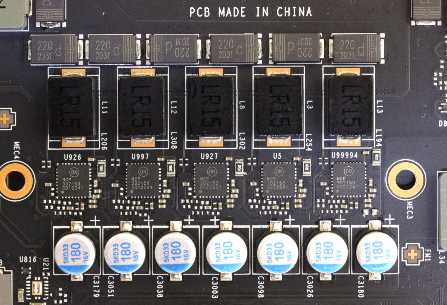 ШИМ-контроллер распаян сзади. Это чип uPI Semiconductor uP9512R. Он достаточно распространённый и на него есть даже схемы по модификации. Он, кстати, обеспечивает только 8 фаз.