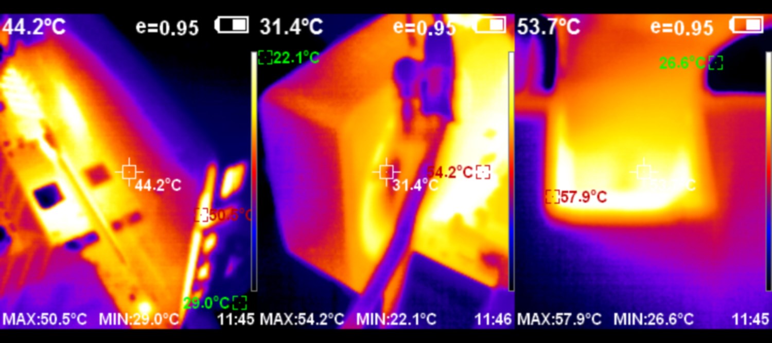 Посмотрим на карту через тепловизор. Самое горячее место обнаружить здесь непросто, ведь вся карта одета в металлический чехол. Нагрев заметен в месте выхлопа горячего воздуха.