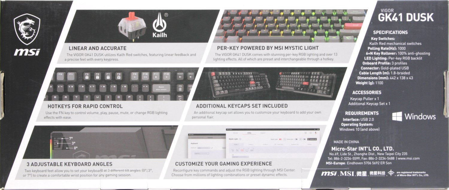 В левой части находится ещё один фирменный логотип с драконом. В правой можно заметить небольшую спецификацию. По центру представлены шесть крупных вставок с описанием ключевых особенностей устройства. Например, здесь сказано, что клавиатура MSI Vigor GK41 Dusk оснащается линейными переключателями Kailh Red. Характеристики здесь не указаны, но известно, что необходимо усилие нажатия 50 гс, полный ход 4 мм и ход до включения - 1,9 мм.