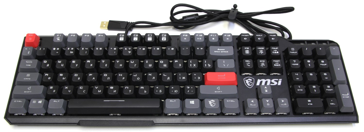 Клавиатура оборудована RGB подсветкой, которой можно управлять. Эффекты можно выбрать на самой клавиатуре или в приложении MSI Center. Понравилось, что при нажатии на функциональную клавишу, другим цветом выделяются те кнопки, которые можно использовать совместно с ней. Это позволяет быстро ориентироваться и выбирать необходимую. Также можно регулировать уровень подсветки и скорость работы эффектов. Три индикатора Caps Lock, Num Lock, Windows Lock также оборудованы RGB светодиодами и поэтому всё выглядит в едином стиле. Провод не очень гибкий и не совсем уж жёсткий. Он дополнительно находится в нейлоновой оплётке, а на конце есть резиновый фиксатор, чтобы можно было его собрать в пучок и зафиксировать, коннектор USB покрыт золотым напылением, а ещё можно заметить ферритовый фильтр.