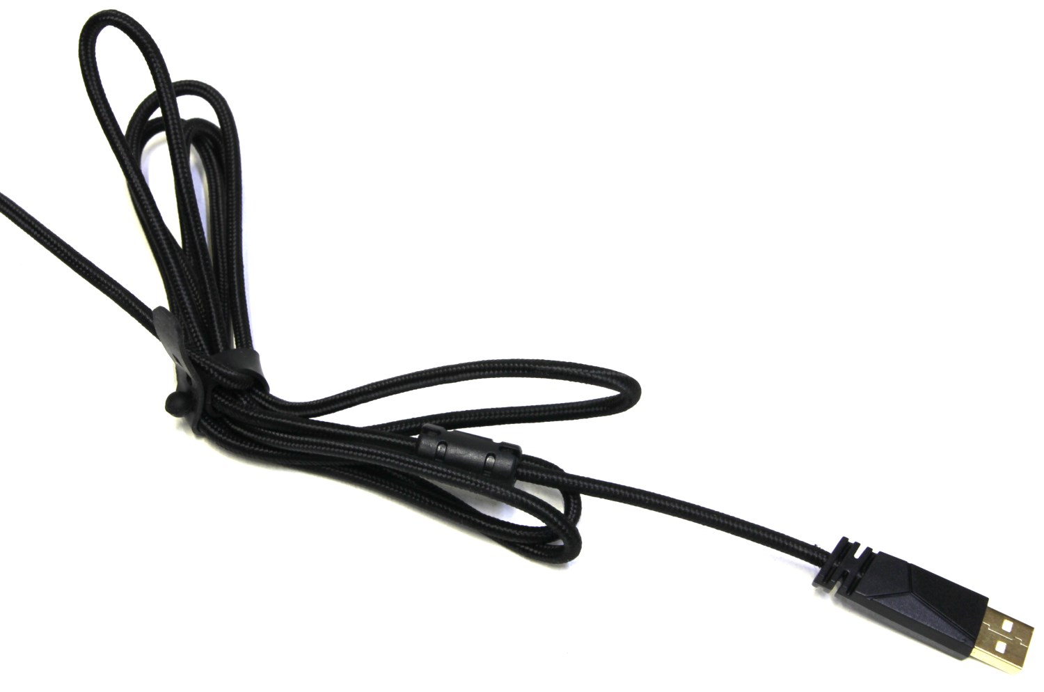 Кабель выходит из задней части. Он средней жёсткости, не совсем мягкий и не очень твёрдый. Ещё он находится в нейлоновой чёрной оплётке. На конце находится коннектор USB 2.0, который покрыт золотым напылением.