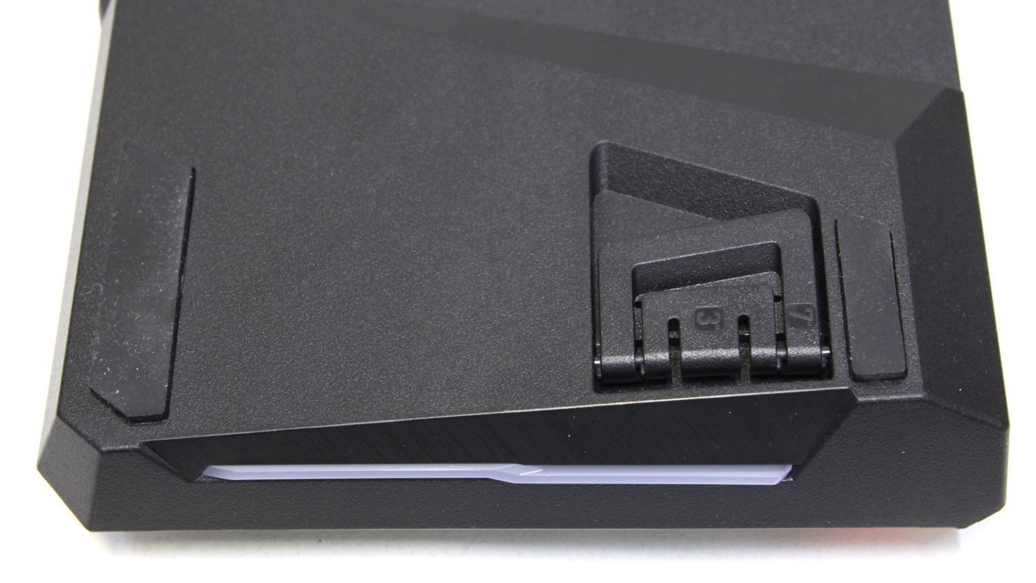 В нижней части, помимо информационной наклейки, находятся опорные площадки из резины, на которых стоит клавиатура. Кроме этого, есть откидывающиеся лапки, которые позволяют поднять заднюю часть и придать угол наклона 3 или 7 градусов. Для этого предусмотрено два комплекта таких опор. Реализация мне показалась достаточно интересной. Мелкие лапки встроены в крупные.