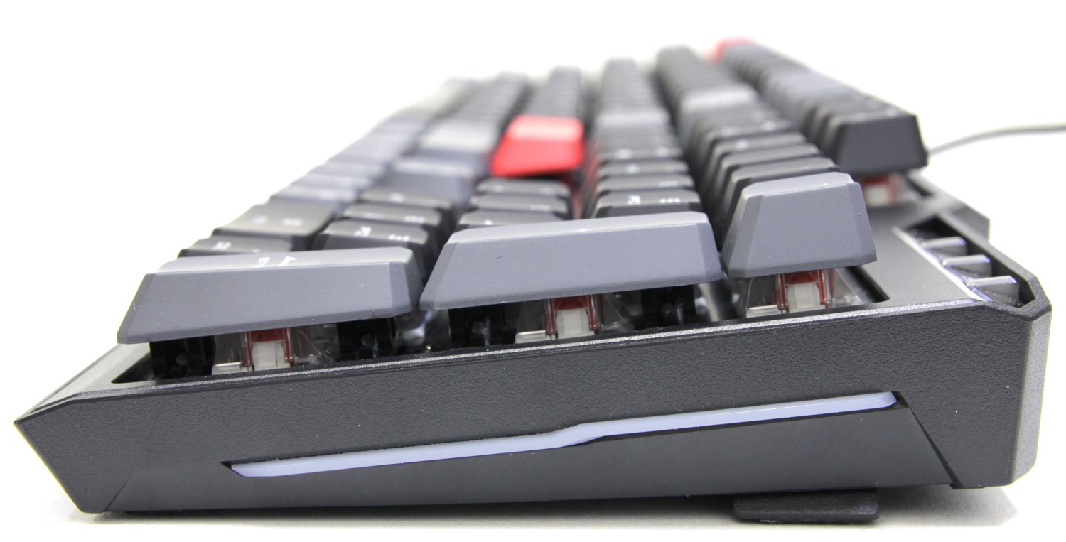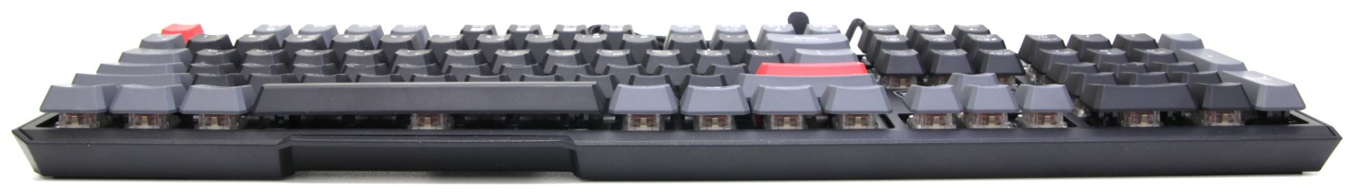 Клавиатура полноформатная и состоит из 104 клавиш. Кейкапы пластиковые с прозрачными символами с подсветкой посередине. Две кнопки выделены красным цветом и еще некоторые серым, а остальные чёрные.