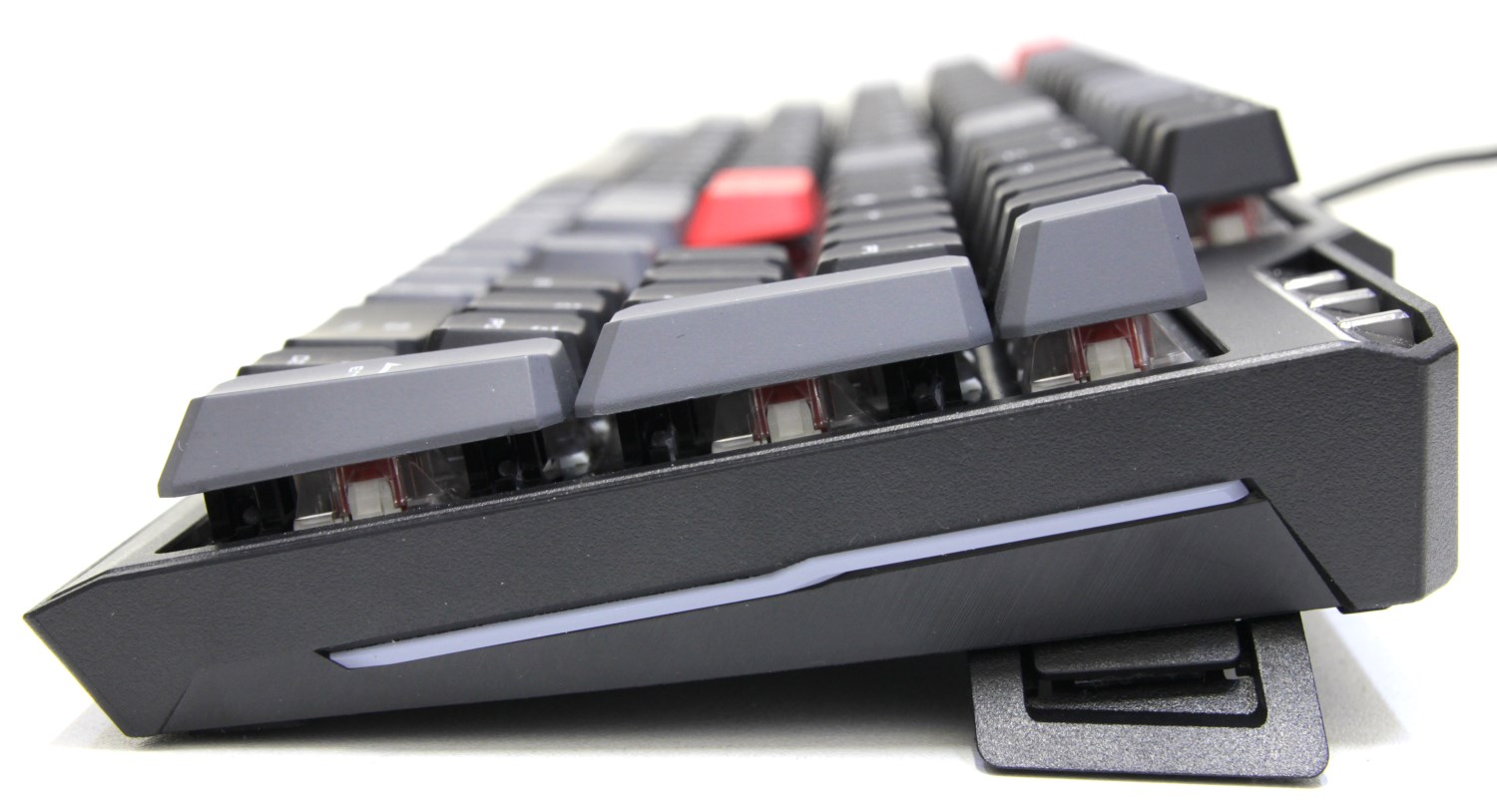 Кейкапы легко снимаются и их можно заменить. Для этого в комплекте есть дополнительный набор. Клавиши можно даже комбинировать, чтобы выделить часто используемые. Свитчи Kailh Red – это аналог Cherry MX Red. С завода они хорошо смазаны. Нажатие плавное, щелчок присутствует и отчётливо слышится. В работе клавиатуру нельзя назвать очень тихой, но пользоваться ей удобно. Для этого здесь возможно установить три угла наклона (0, 3 и 7 градусов), для чего реализован механизм ножек в задней части, где маленькие лапки встроены в большие. Также есть резиновые площадки для опоры, и клавиатура не скользит по столу.