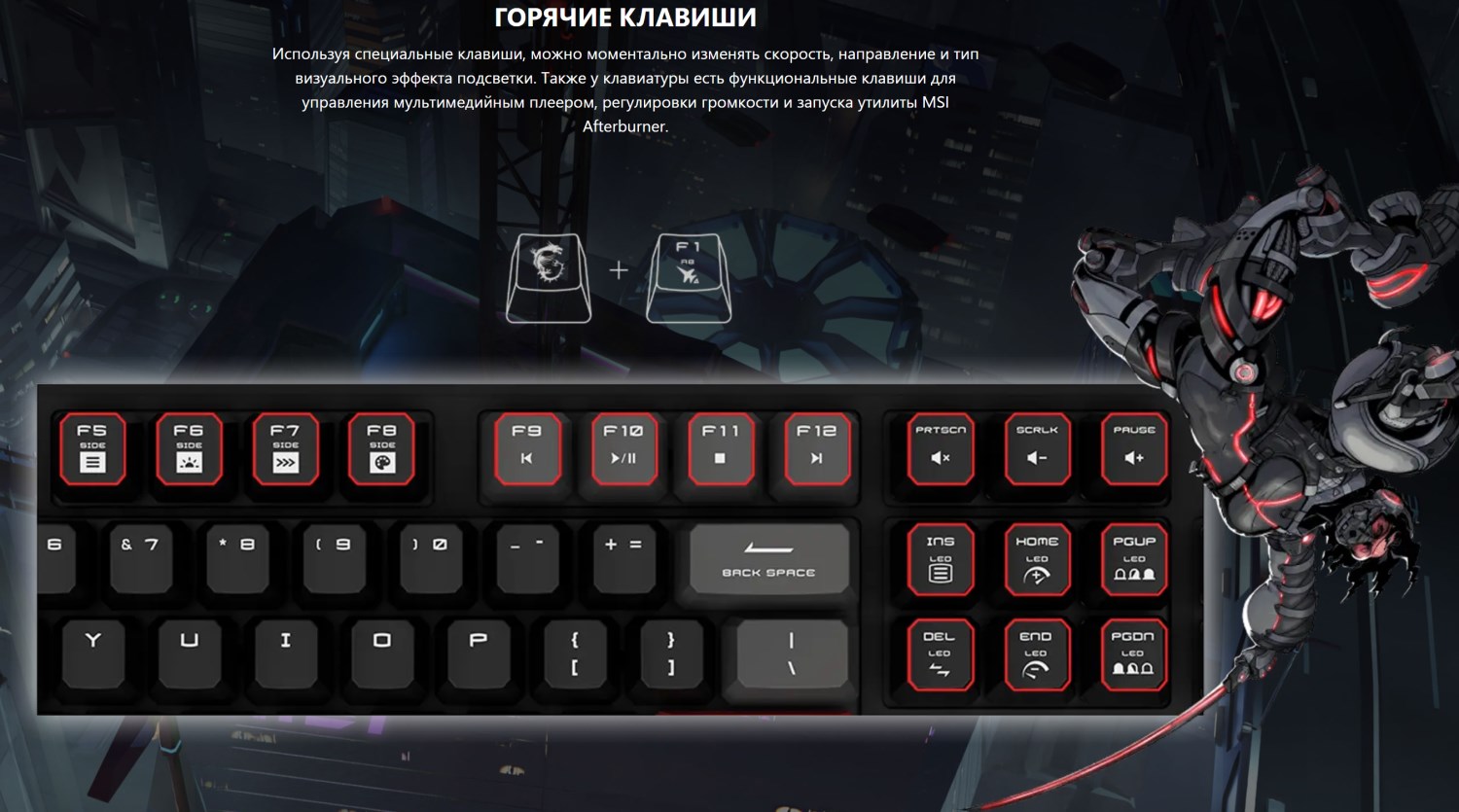 В целом оформление достаточно лаконичное, особенно спереди. Здесь в левой части можно заметить эмблему серии MSI Gaming. По центру находится крупное изображение самой клавиатуры, где можно заметить, что пара кнопок выделена красным цветом, а остальные серые или чёрные. RGB подсветки не видно, но в левом верхнем углу есть соответствующий значок, а значит она есть.