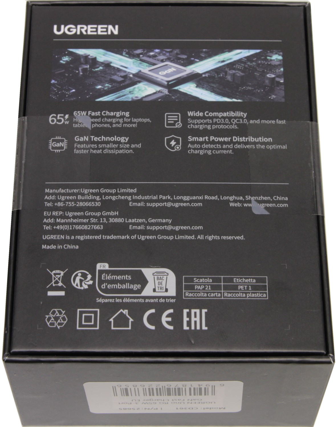 Его можно заметить над изображением устройства и в левом нижнем углу. Там же ещё указано, что это первый робот с GaN зарядкой Ugreen. Там же производитель немного хвастается и уверяет, что MacBook 13 Air заряжается до 70% всего за 1 час. Пока приходится лишь поверить на слово. В самом низу указано, что это трехпортовый адаптер. Есть уточнение, что здесь два разъёма USB Type-C и один USB Type-A.