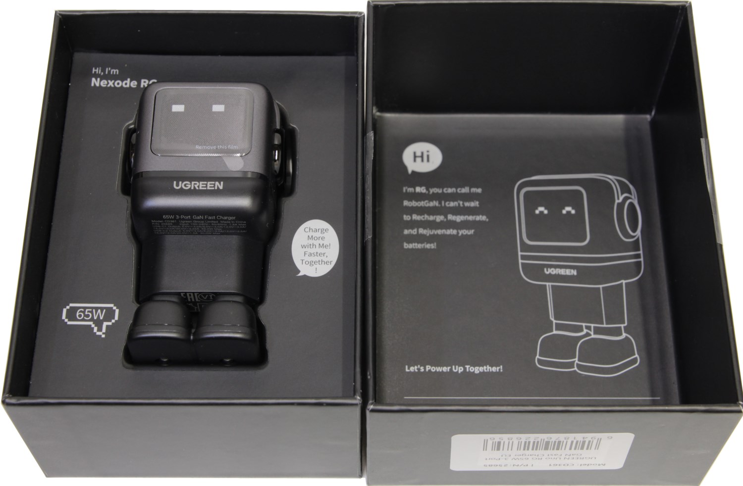 Внутри тоже всё выполнено в цвете, а устройство упаковано в лотке как игрушка. Есть даже какие-то надписи. Причём они присутствуют даже на внутренней стороне верхней части коробки. В частности, устройство здесь представляется как Nexode RG (Robot GaN)