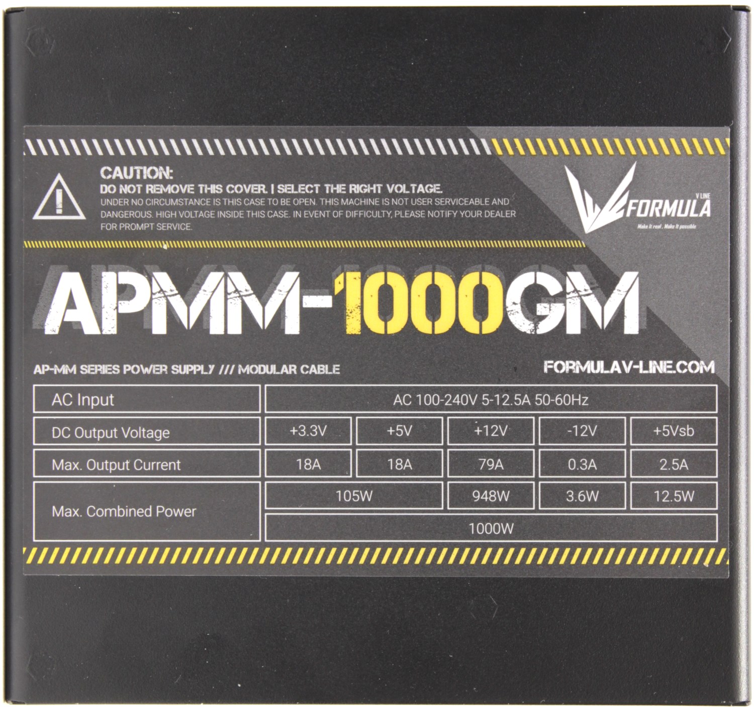 По центру крупными символами указано название модели. В правом верхнем углу расположен золотой, блестящий логотип компании Formula V line. Внизу серым цветом ещё раз повторяется число 1000, но на этот раз уточняется, что это мощность в ваттах. В левом нижнем углу находится небольшой значок 80 Plus Gold.
