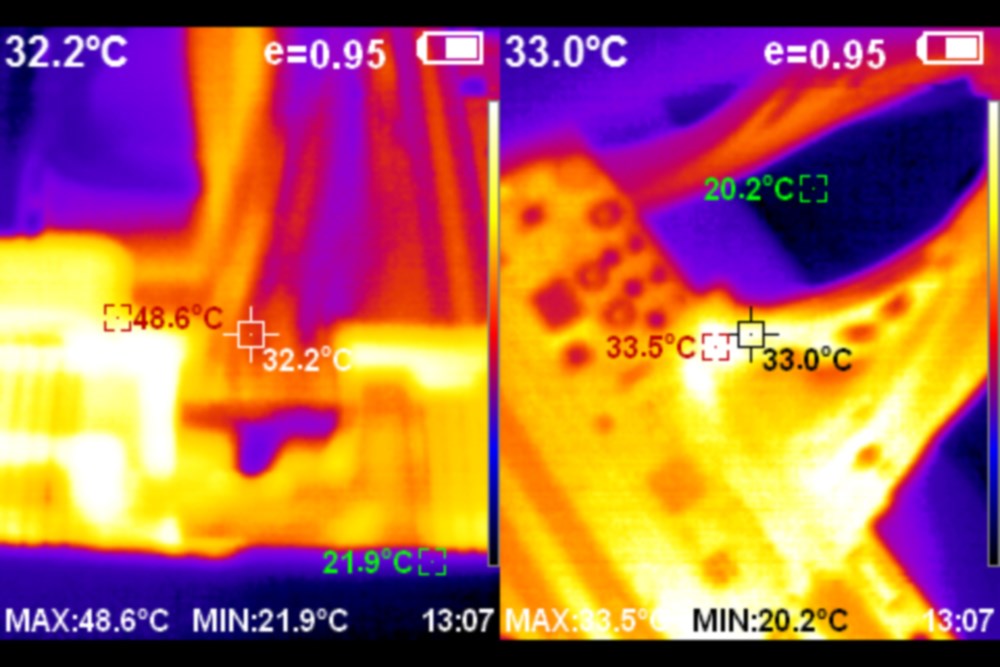 Тепловизор показывает, что блок питания при нагрузке греется не сильно. Это объясняется тем, что вентилятор работает постоянно. Его минимальная скорость составляет 750 об/мин. Шум при этом с расстояния 30 см составляет 28.4 дБ, что реально очень тихо.