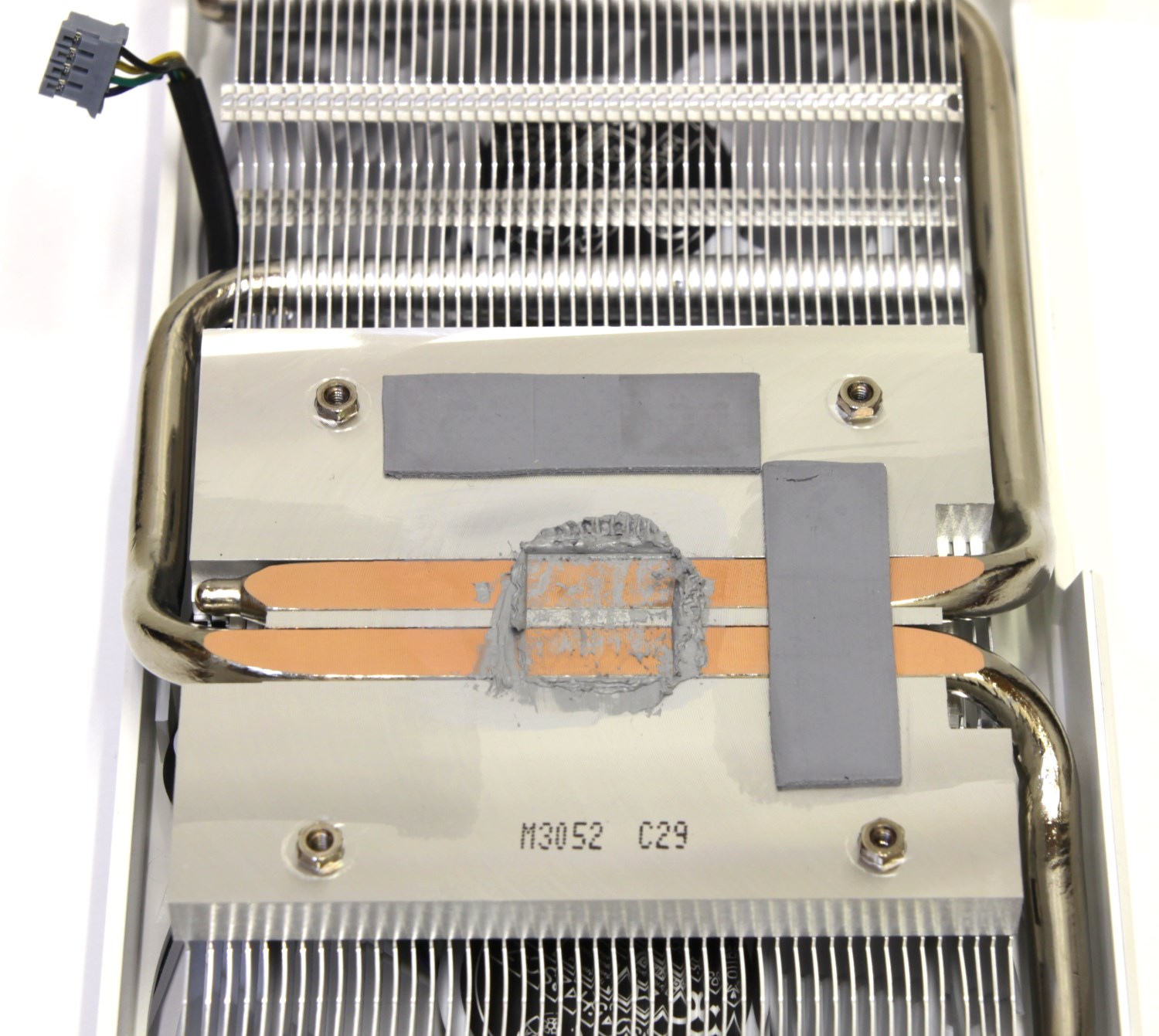 Сам кулер изготовлен по упрощённой схеме с одной секцией и двумя тепловыми трубками. Несмотря на скромные размеры кристалла, используется технология прямого контакта тепловых трубок. Они проходят по центру крупного алюминиевого основания сверху вниз. Графический процессор контактирует с ними через термопасту, микросхемы памяти – через тонкие термопрокладки.