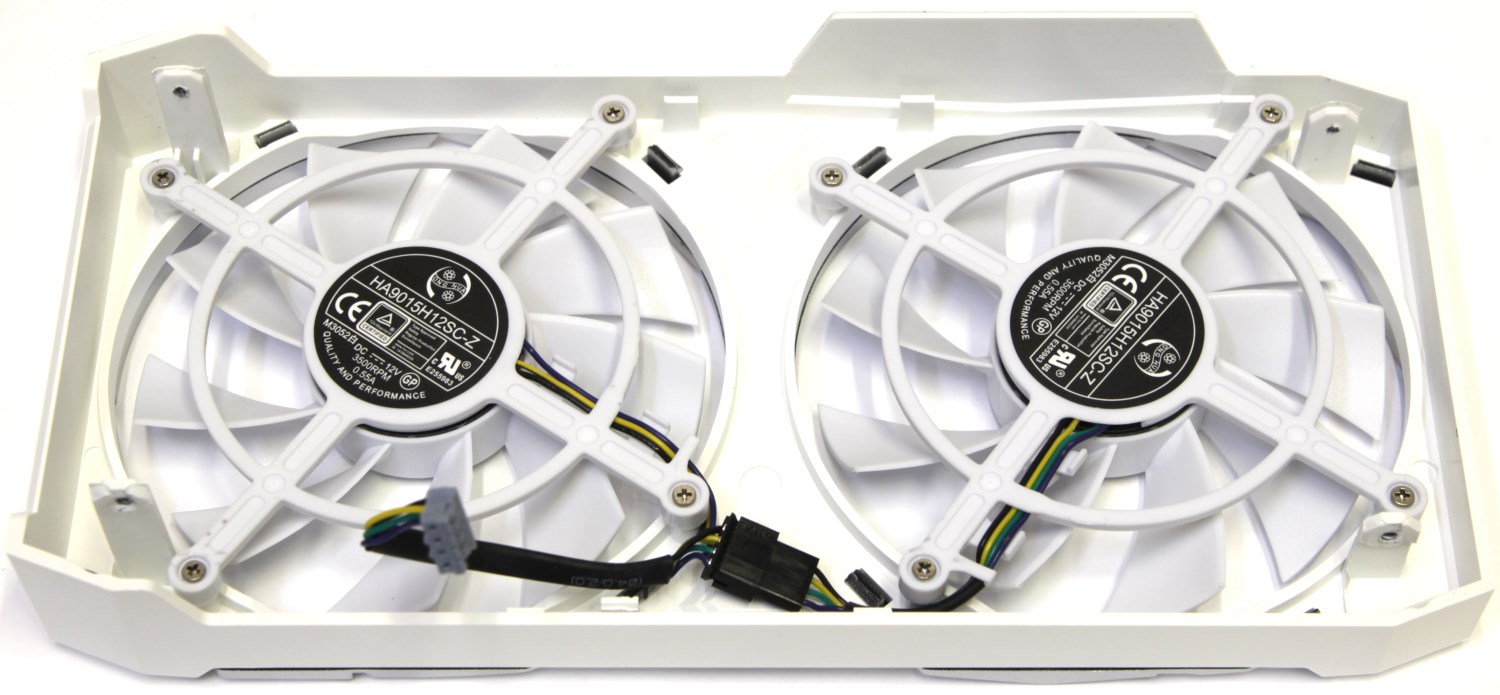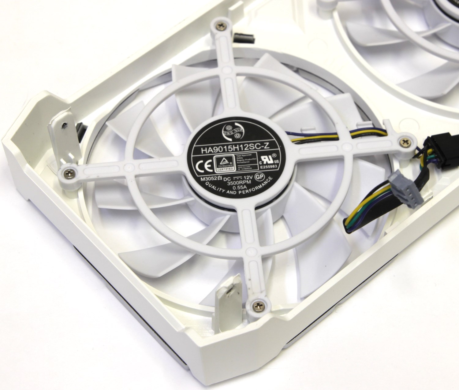 Пластиковый кожух белый с серебристыми вставками. Он фиксируется четырьмя саморезами через специальные отверстия в пластинах. Вентиляторы здесь крепятся непосредственно к кожуху.