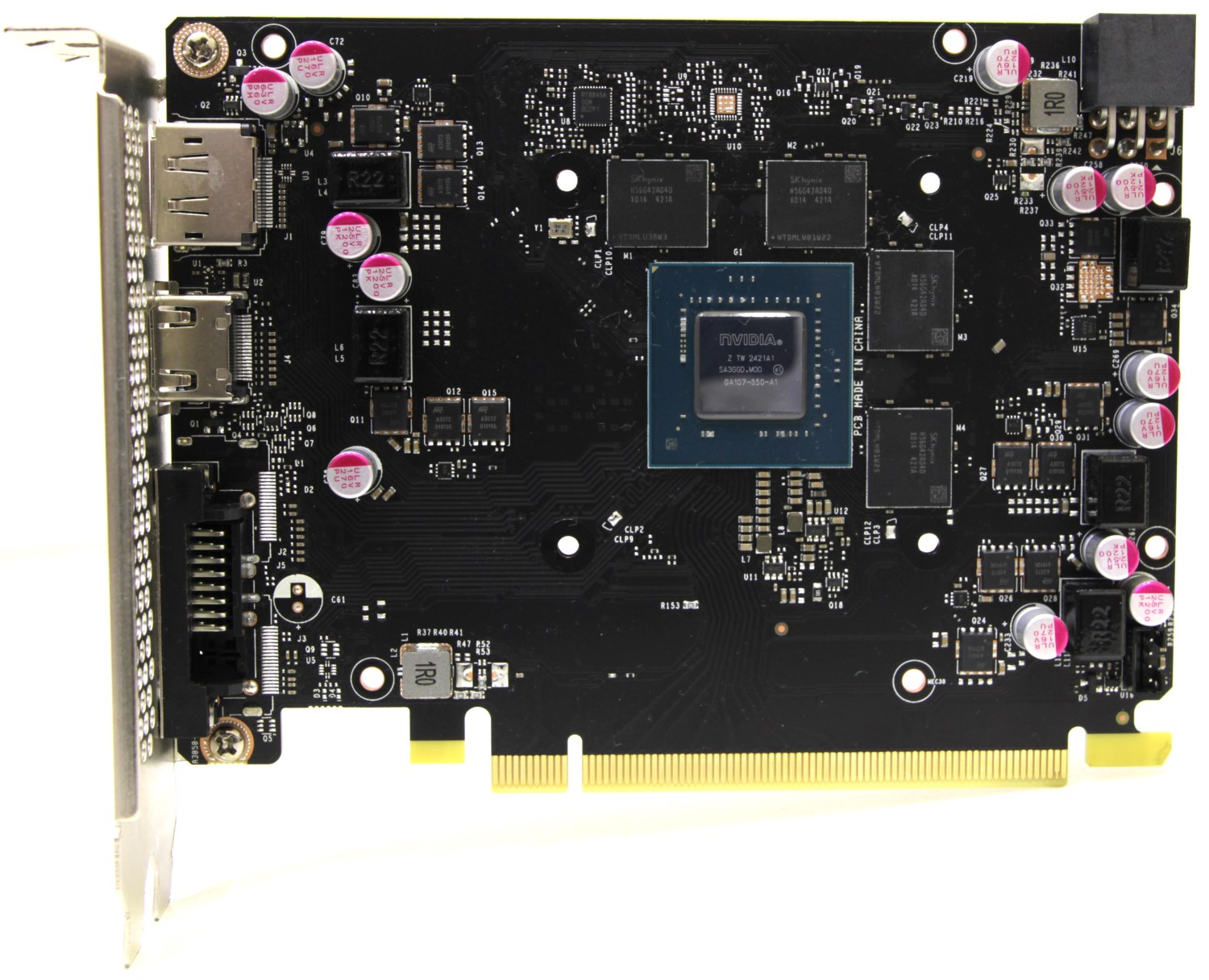 200 кв. мм выполненных по 8 нм техпроцессу Samsung. Четыре микросхемы памяти типа GDDR6 распаяны только спереди. Пустых мест нет, и в BIOS платы не упоминаются более ёмкие чипы. У RTX 4060 площадь чипа кристалла на четверть поменьше, но там используется другой техпроцесс от другой компании.