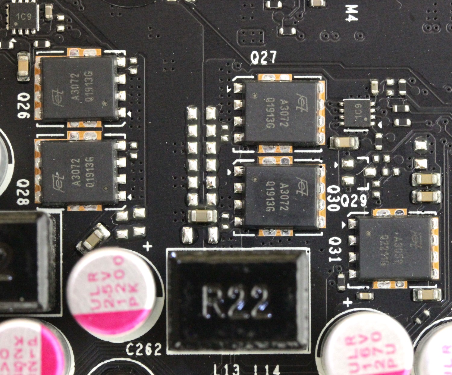 На каждую фазу приходится по три транзистора и одному драйверу. Видимо, четыре элемента дешевле одной DrMOS сборки, иначе непонятен смысл такой конфигурации. Также на каждую из четырёх фаз приходится по одной катушке индуктивности.